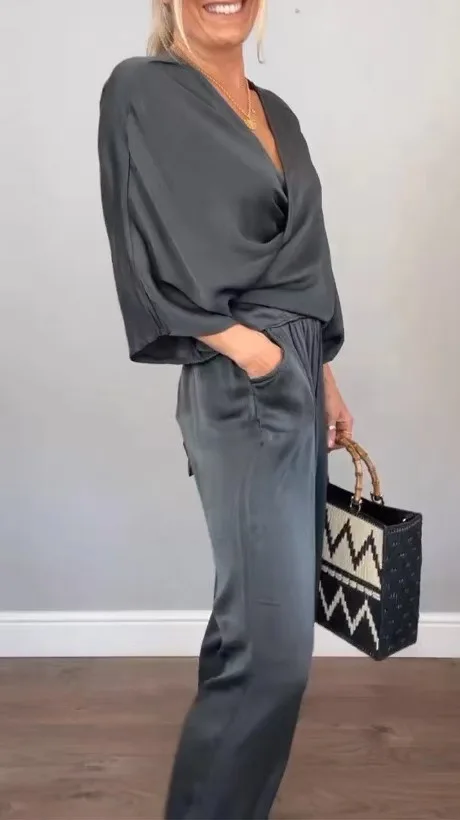 Unleash effortless elegance with the Satin Summer Suit Set, featuring a stylish V-neck top and wide-leg pants duo. Crafted from luxurious synthetic fibers, this set offers a relaxed fit and batwing sleeves for a chic silhouette. Available in rich colors, it’s perfect for any occasion. Elevate your wardrobe with this versatile ensemble today!