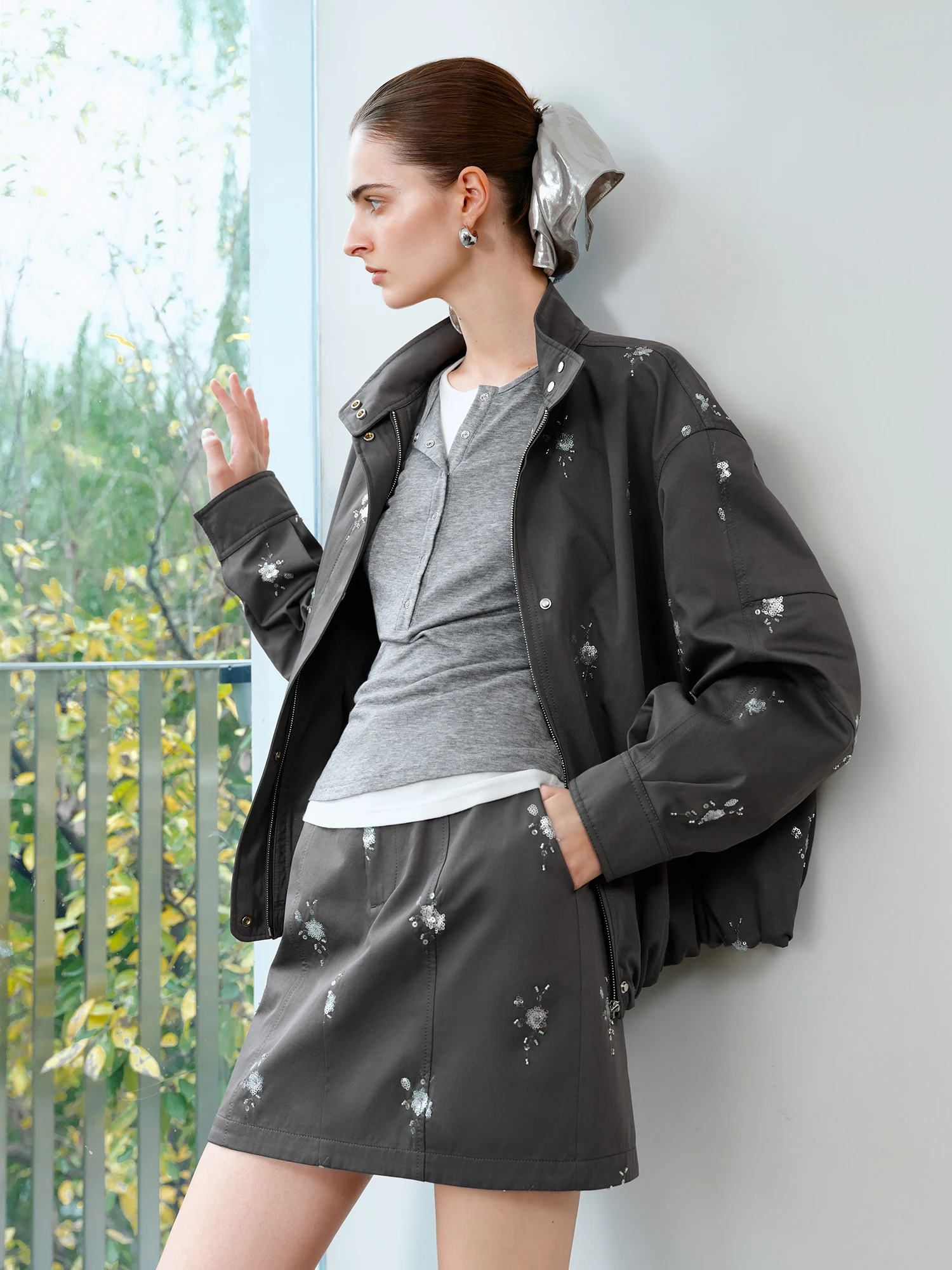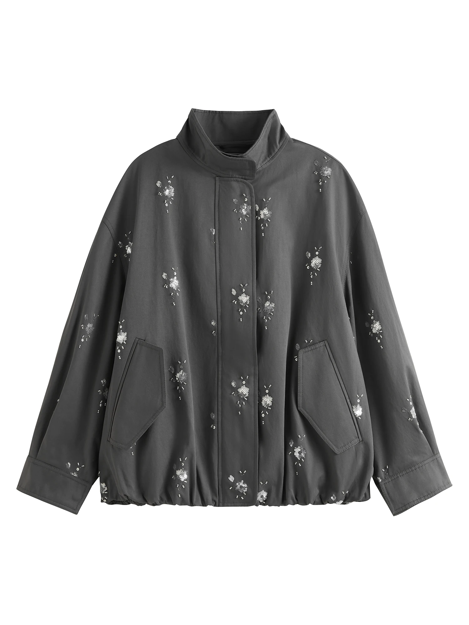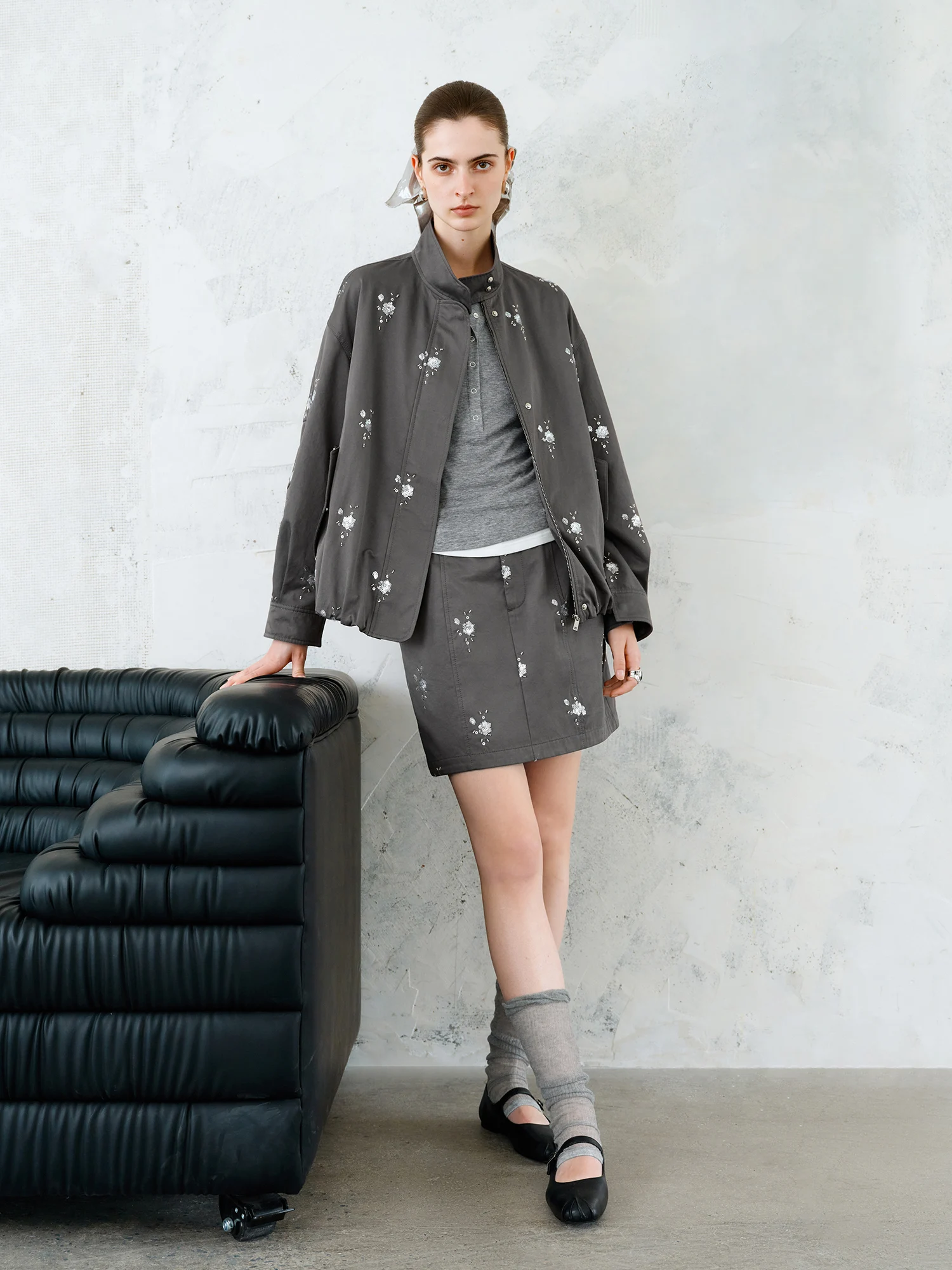 This sequined short jacket and knee-length skirt set is tailored for women seeking a refined casual look with a touch of subtle elegance. Crafted from a blended fabric of 56.5% cotton and 43.5% polyester, it offers a structured yet comfortable fit suitable for spring and summer wear.