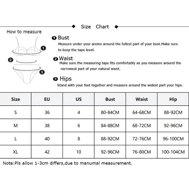 | Size | US | UK | AU/NZ | EU | Bust (cm) | Waist (cm) | Hips (cm) |