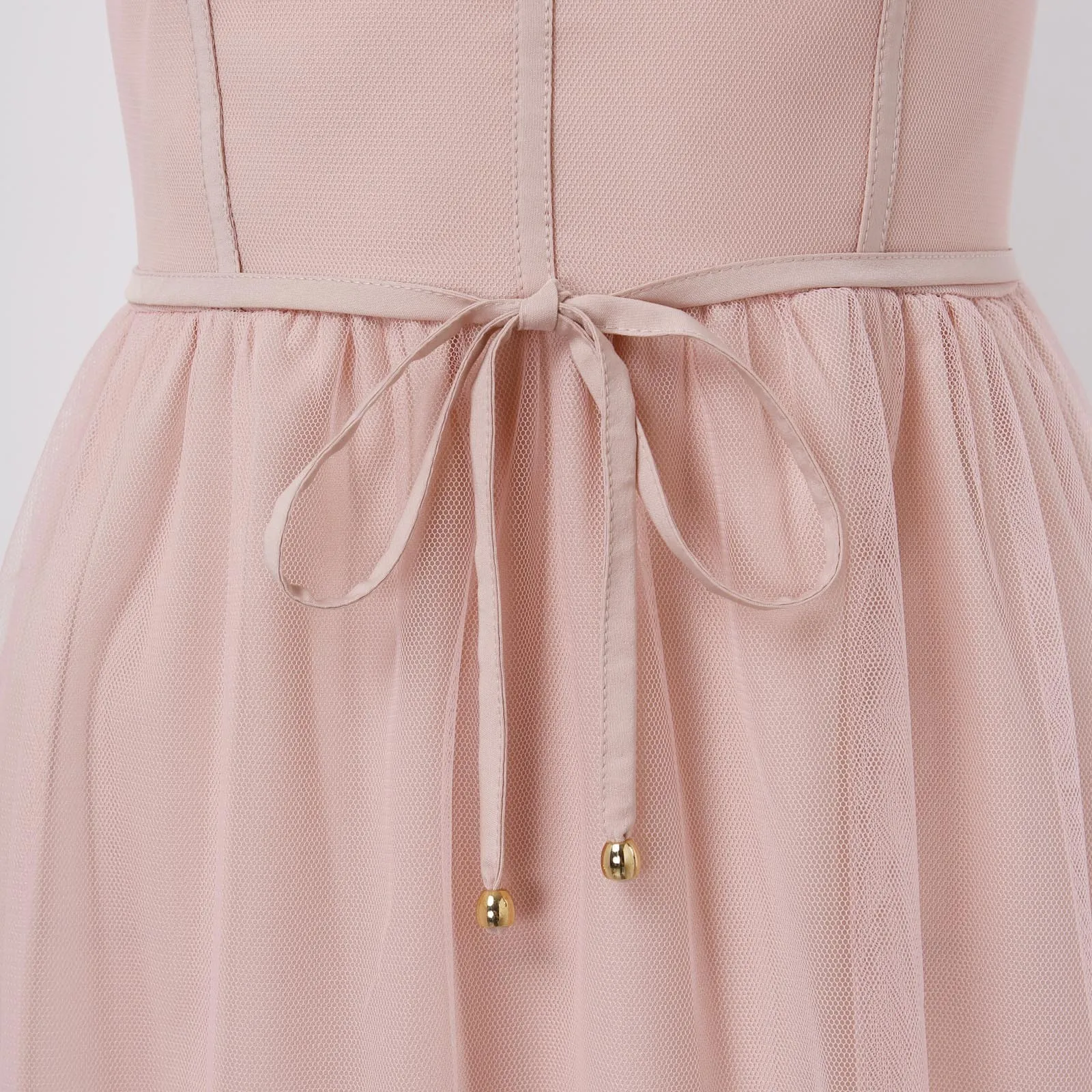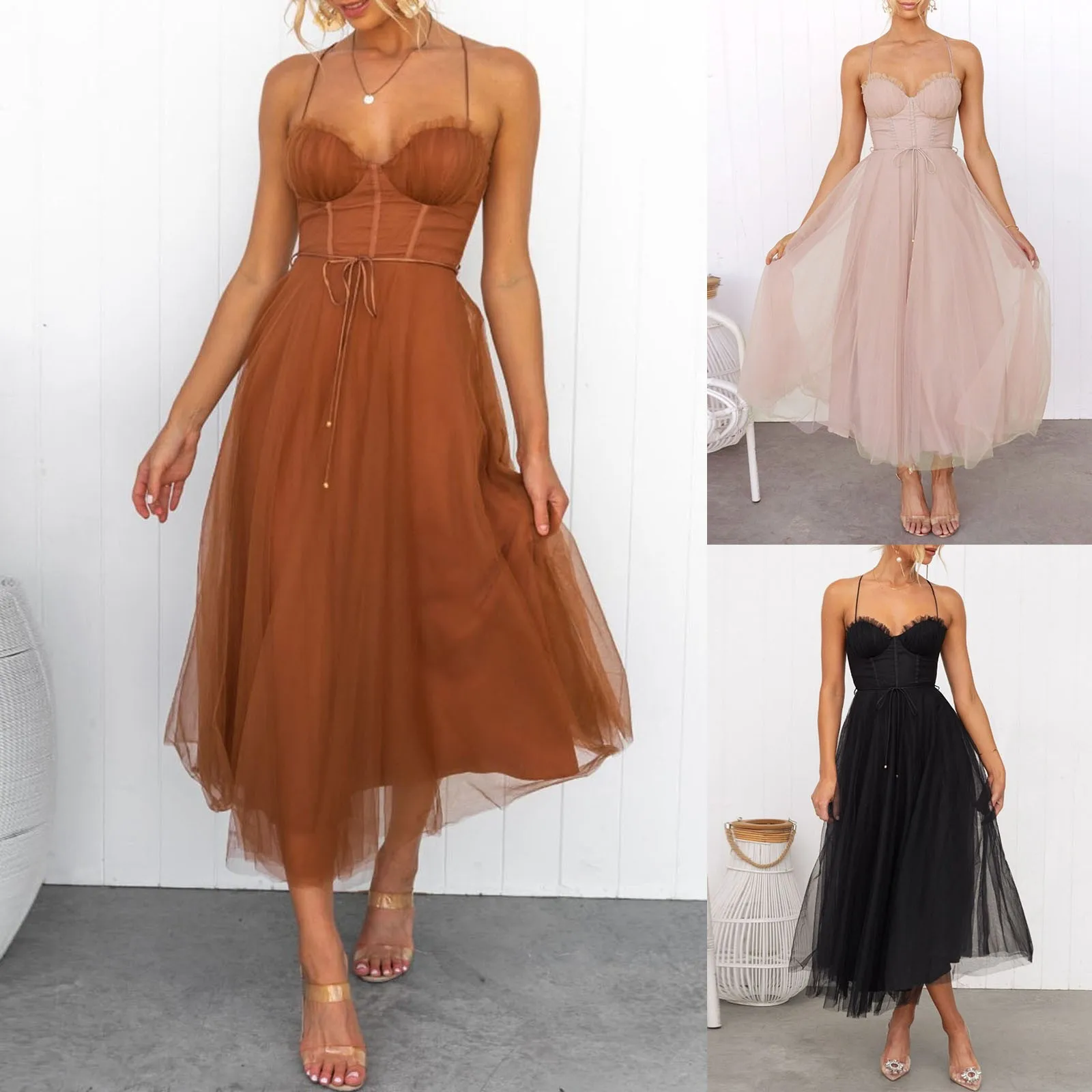 Unveil your elegance with this stunning spaghetti strap mesh stitching long dress. Crafted from luxurious natural fiber, its backless design and drawstring waist create a flattering silhouette that complements every curve. Available in classic black, chic brown, and soft pink, this knee-length dress is perfect for any evening party. Embrace effortless sophistication!