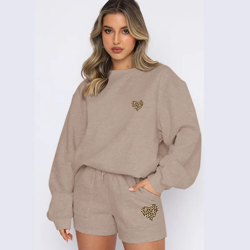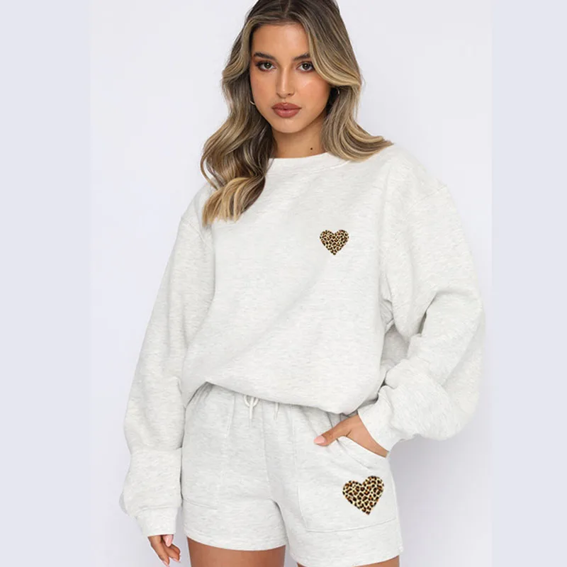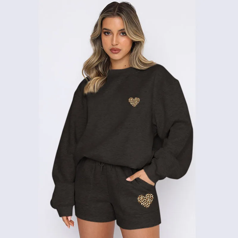 Indulge in effortless sophistication with this leopard heart print lounge set. Crafted from premium polyester, this relaxed two-piece features a comfortable top and drawstring shorts perfect for leisurely days. Available in stunning shades from classic black to soft pastels. The playful print adds a touch of personality to your casual wardrobe.