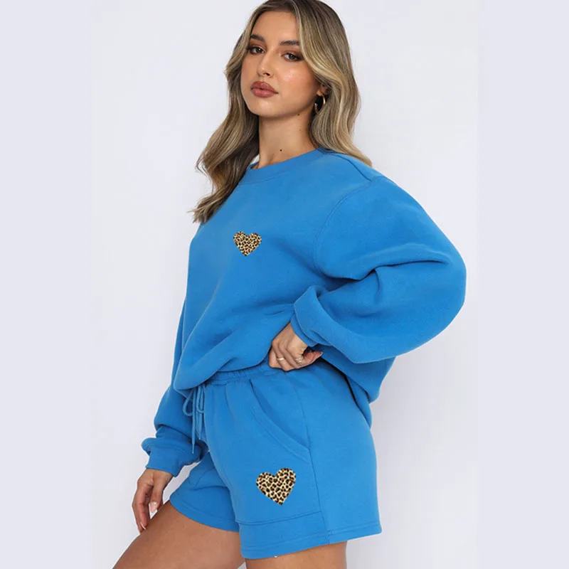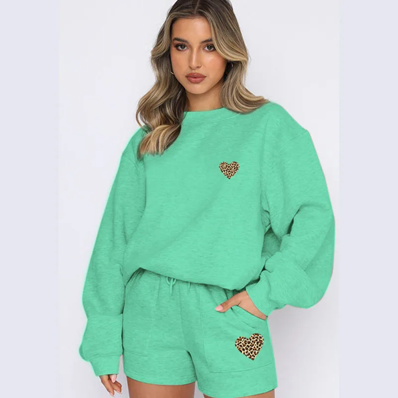 Leopard Heart Print Lounge Set Women Drawstring Shorts Outfit