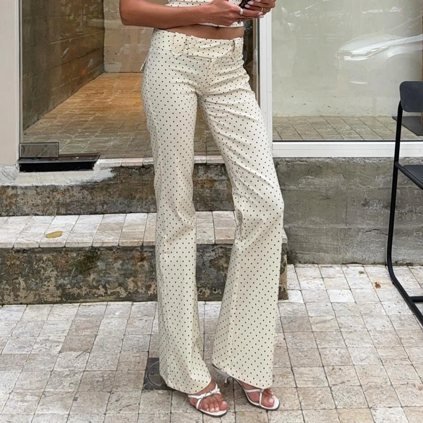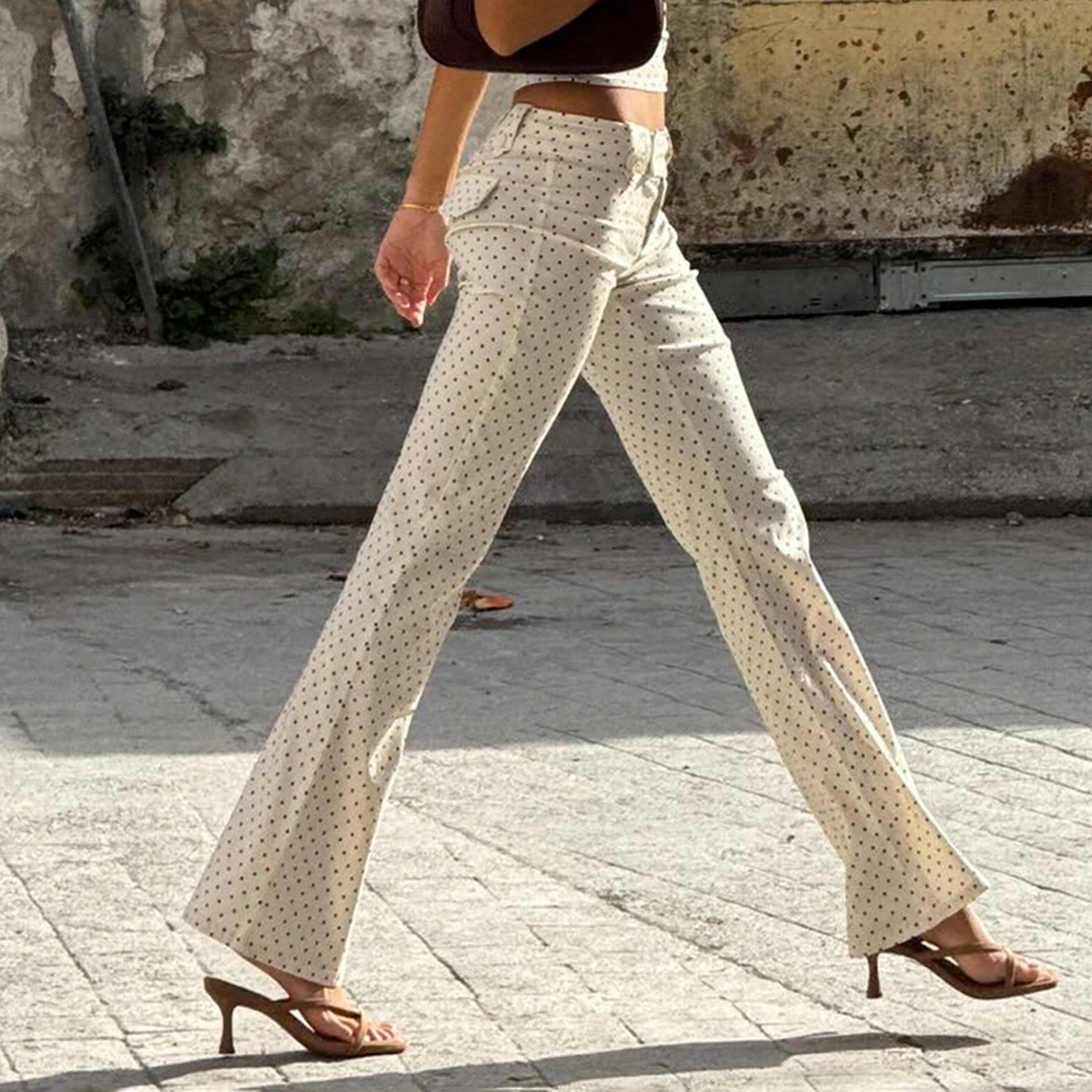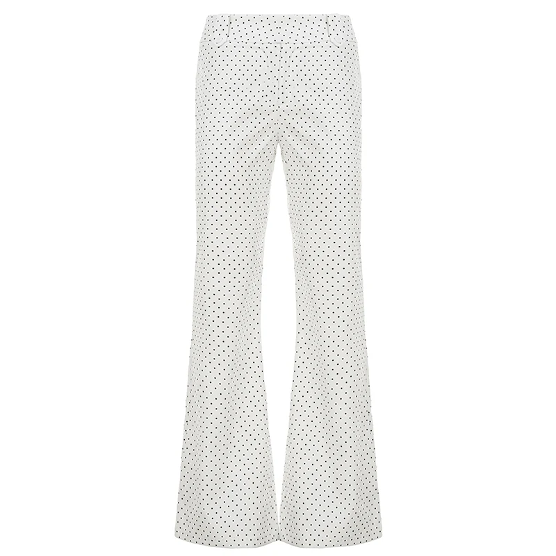 Timeless Y2K-inspired straight leg trousers featuring classic polka dot patterns in sophisticated black or white. Low-rise design with button fly closure creates a flattering silhouette. Crafted from premium woven polyester with slight stretch for comfortable all-day wear. Perfect for casual occasions with a touch of retro elegance.