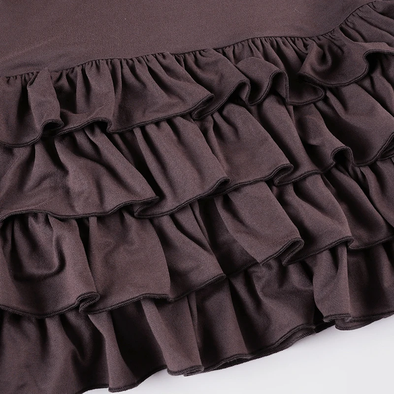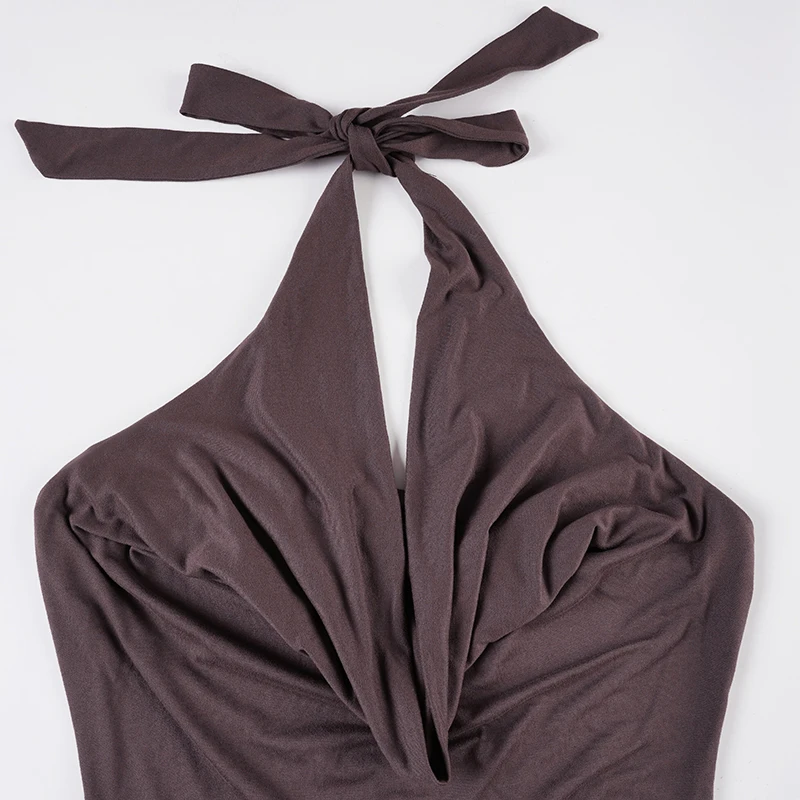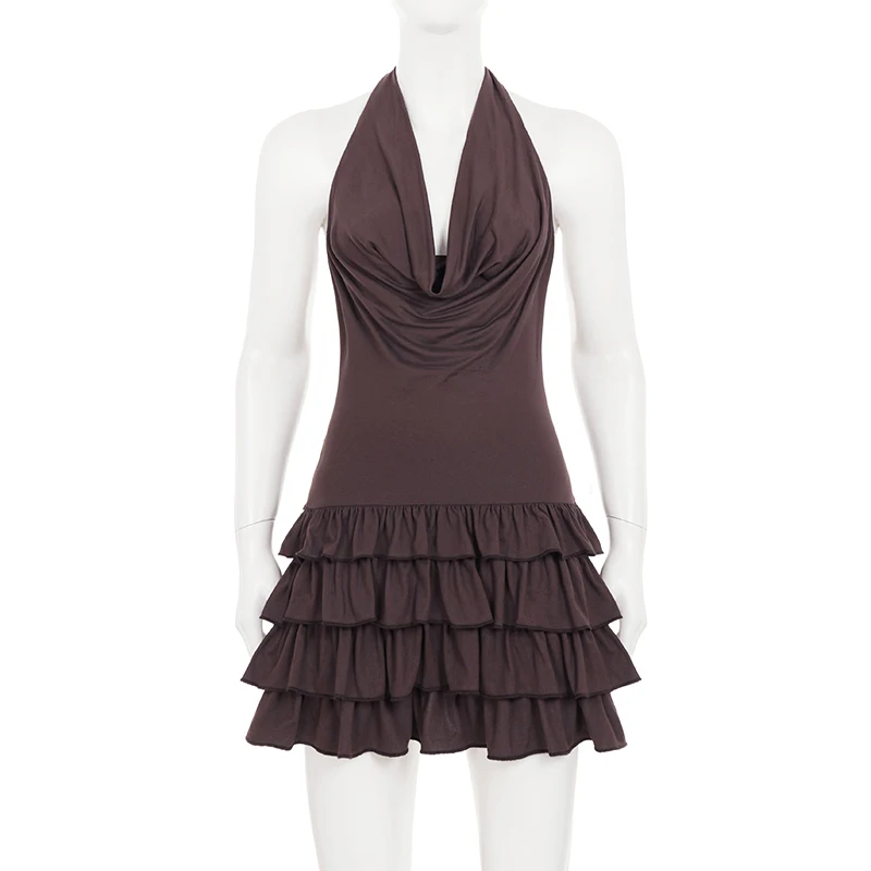 Sophisticated dark brown halter mini dress crafted from premium polyester blend with subtle stretch for comfort. Features an alluring backless design and flattering A-line silhouette that creates a streamlined fit. The dropped waistline and tiered detailing add graceful movement, while the sleeveless cut keeps you cool during warm weather. Perfect for summer parties and special occasions. Available in S, M, L sizes for the ideal fit.