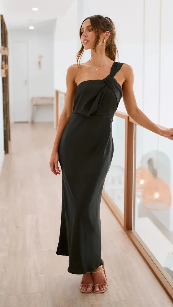 Satin Summer Dress: Elegant Slanted Shoulder Style