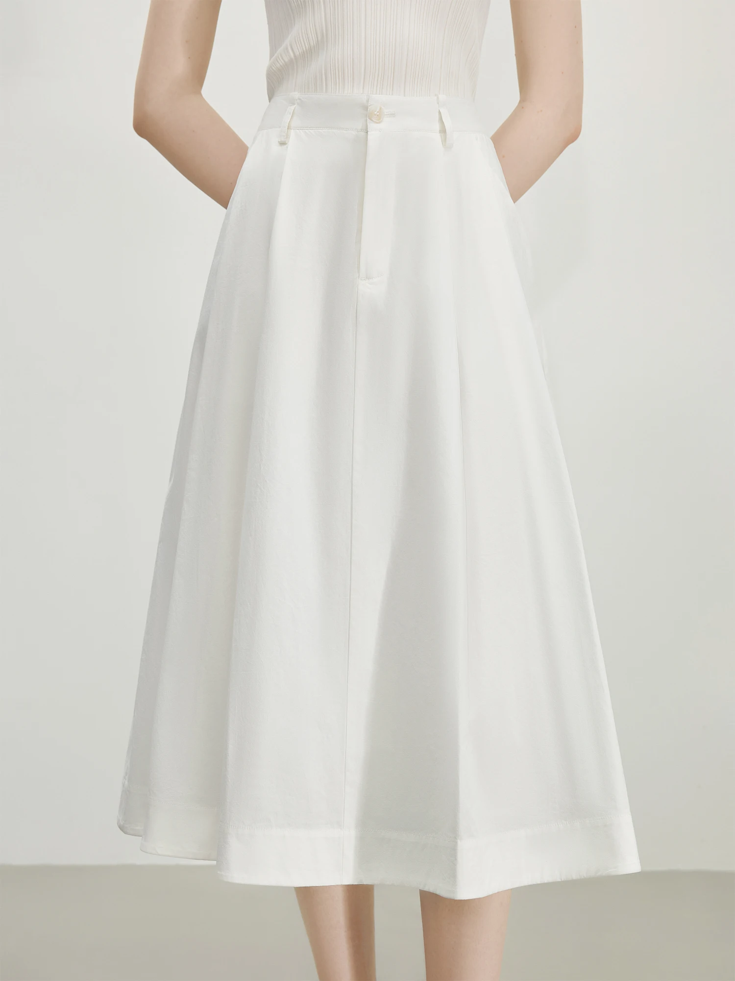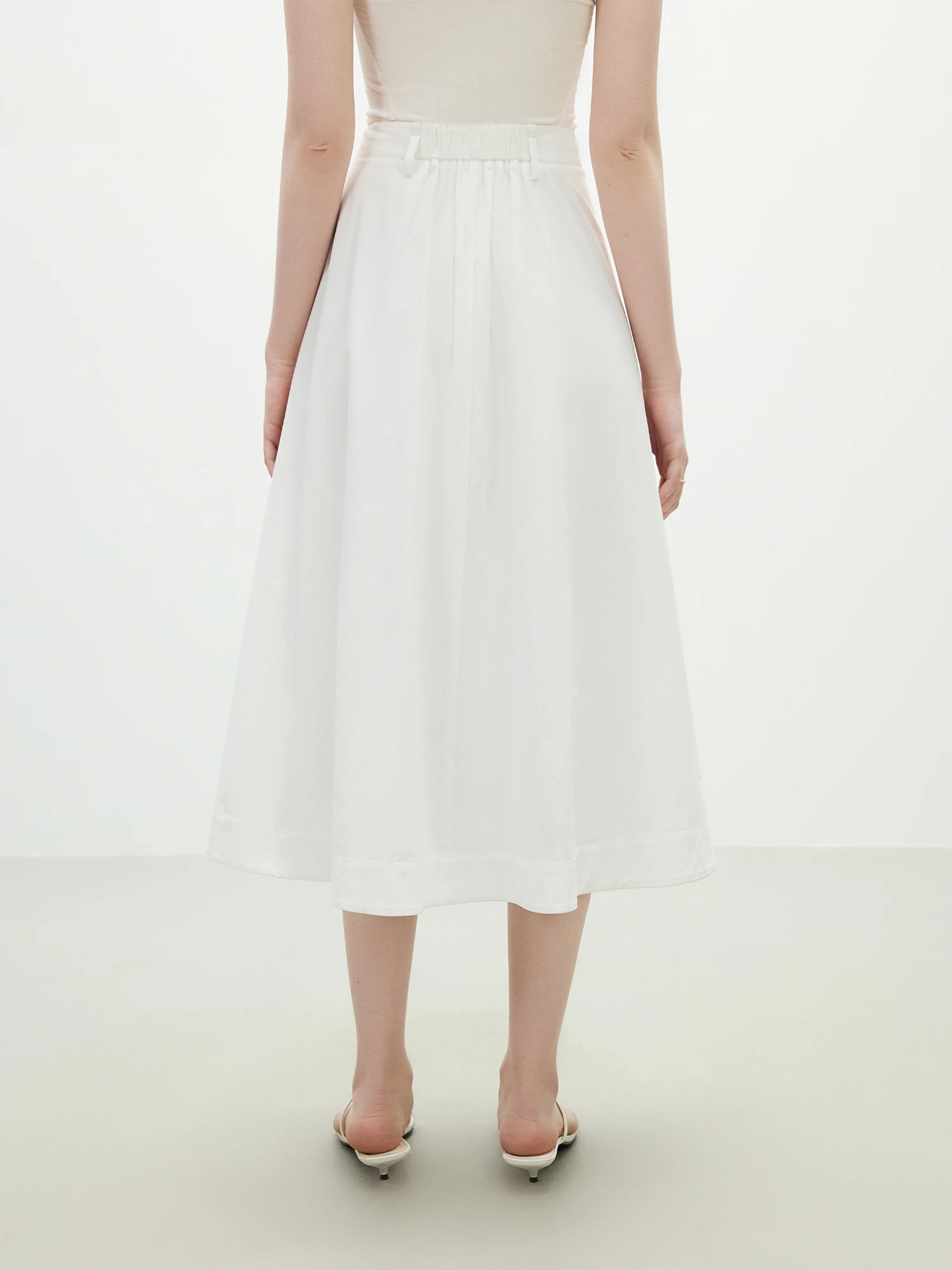 Embodying modern minimalism, this Summer High Waist A-Line Midi Skirt in pristine white offers a refined silhouette crafted from breathable 100% cotton broadcloth. The fabric’s slight stretch enhances comfort while maintaining structure, making it suitable for warm days and transitional seasons alike.