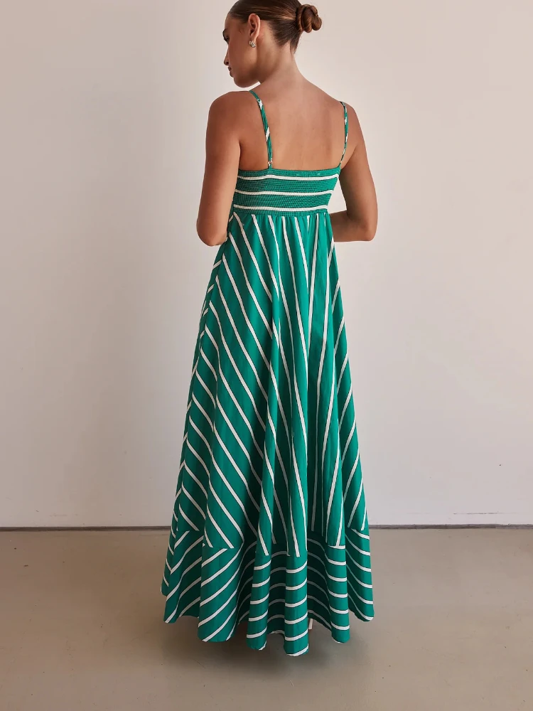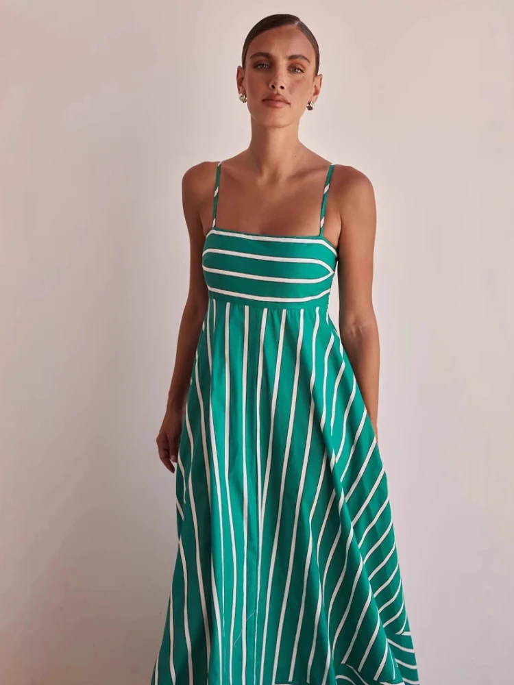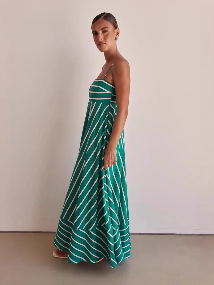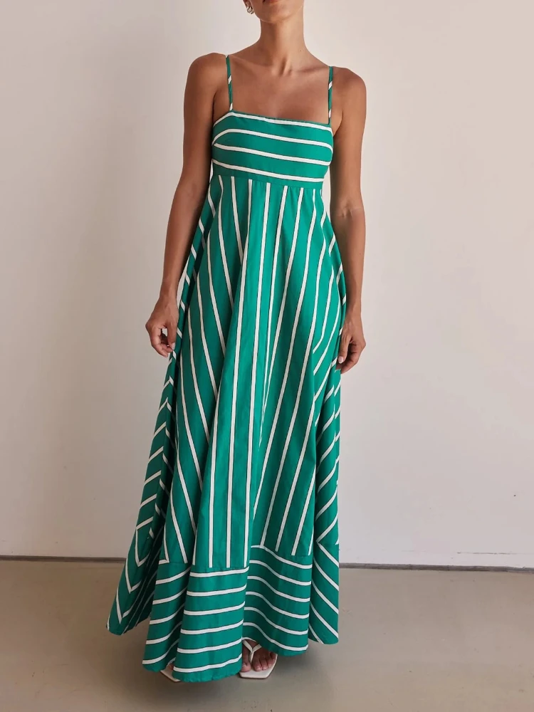 Embrace effortless elegance this summer with our A-Line Backless Dress. Crafted from luxurious polyester, this ankle-length beauty features a flattering silhouette, a chic slash neckline, and delicate spaghetti straps. Its vibrant green striped pattern is perfect for any occasion, making you feel confident and stylish. Designed for every body, this dress is your go-to choice for both office and resort wear. Experience the perfect blend of comfort and sophistication today!