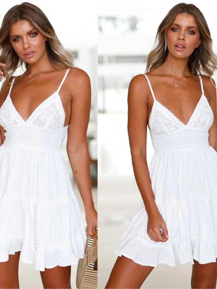 7 reviews for Elegant White Spaghetti Strap Mini Dress for Beach Parties