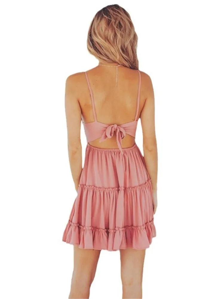 This mini dress is not just a piece of clothing; it’s an invitation to celebrate your individuality. The spaghetti straps and V-neckline create a stunning frame for your shoulders while the lace-up decoration adds a touch of elegance. Whether you’re attending a beach party, a casual brunch with friends, or an evening garden gathering, this dress is tailored to move with you, ensuring you feel comfortable, confident, and beautiful.