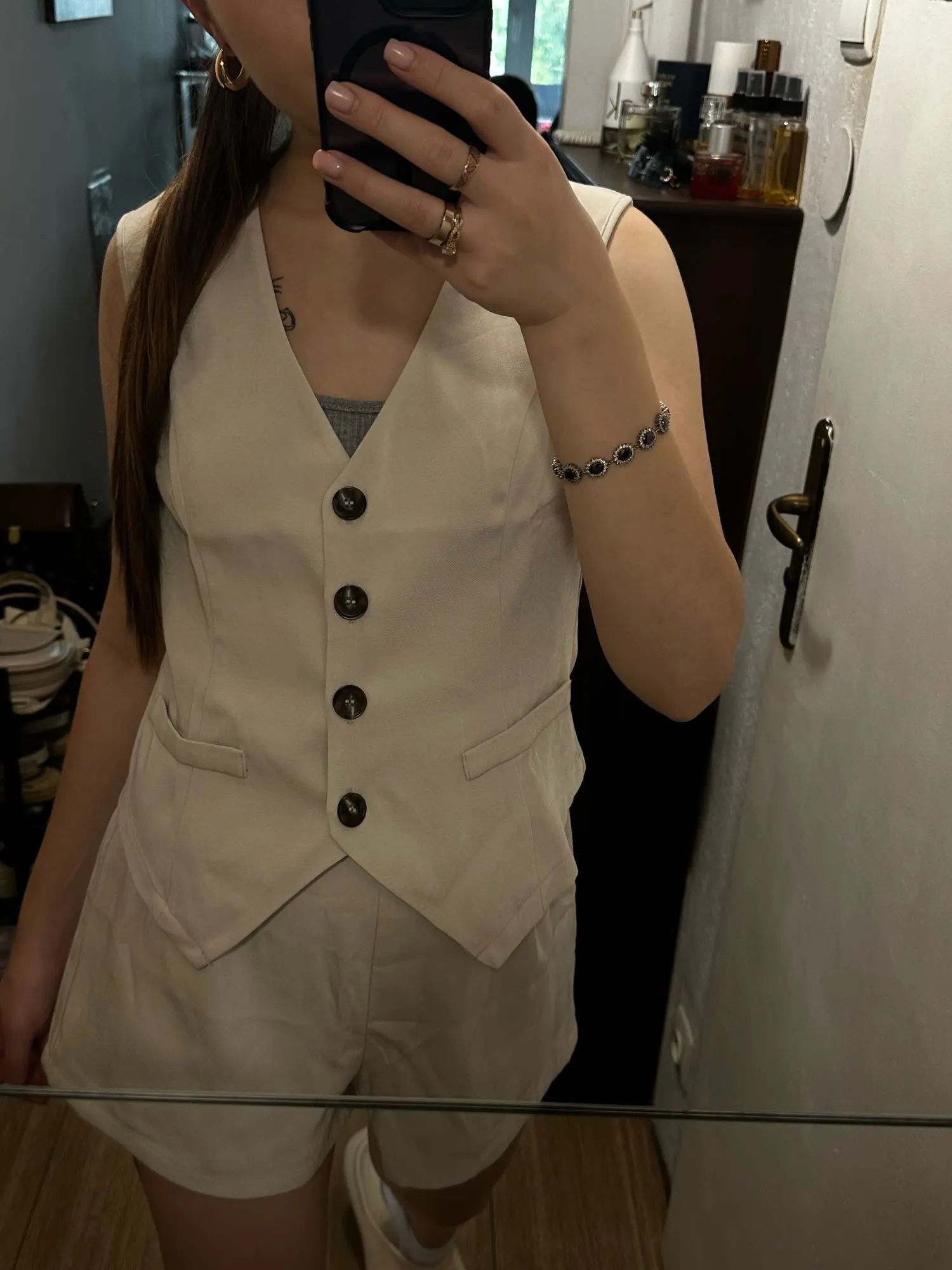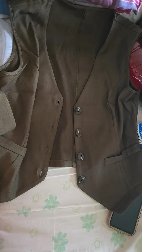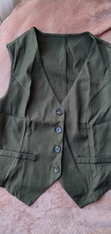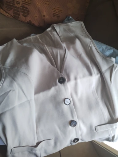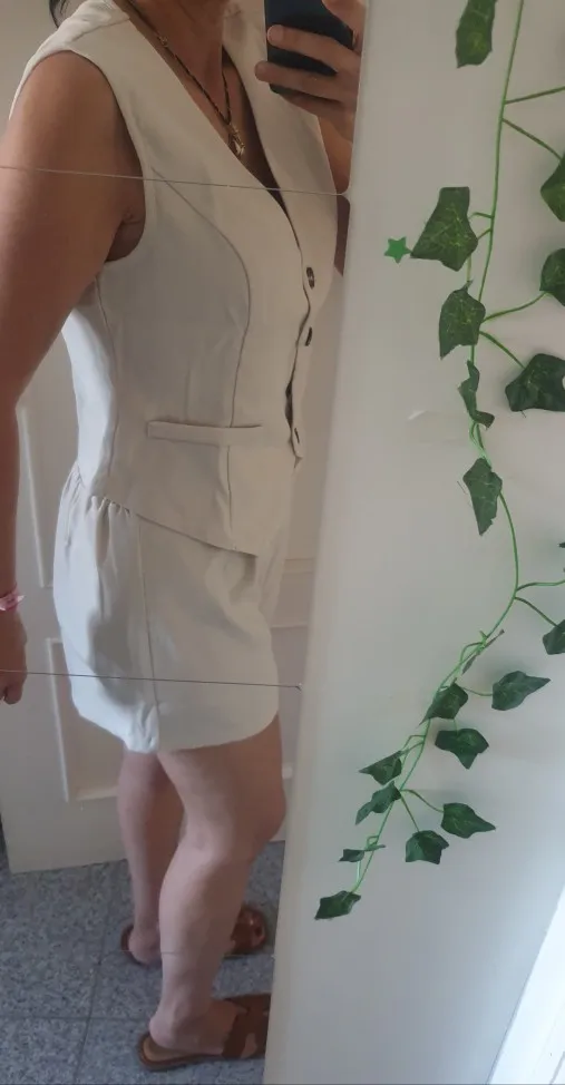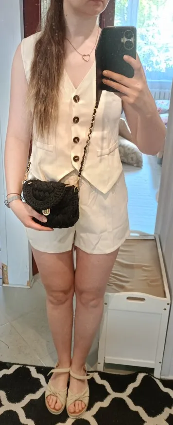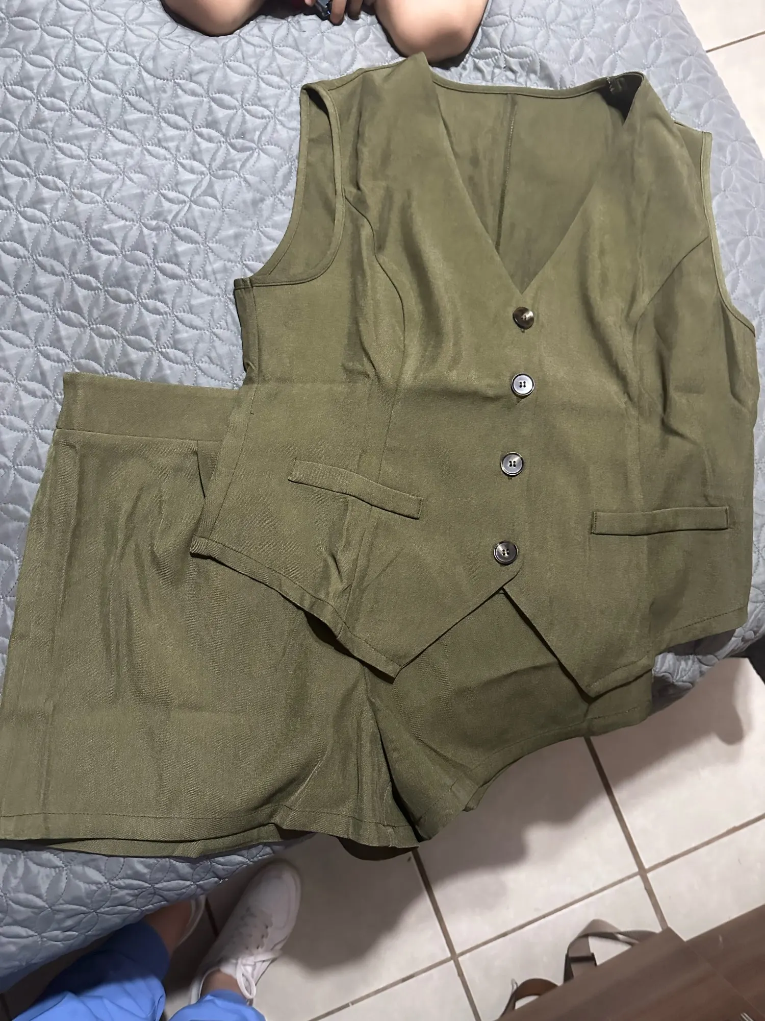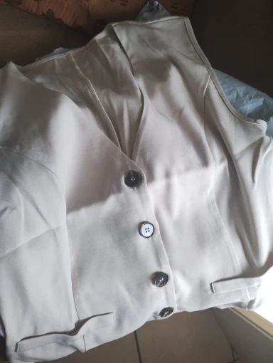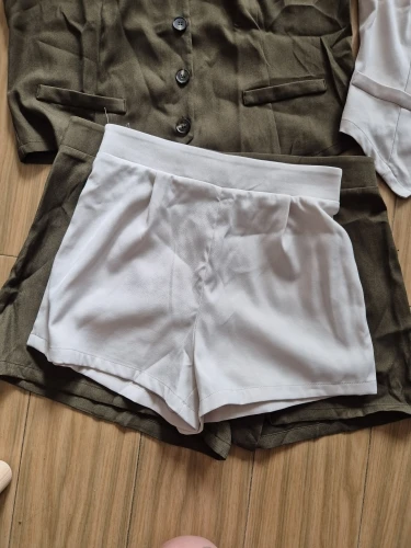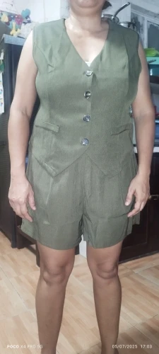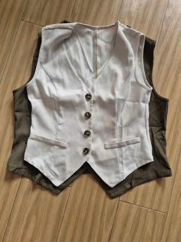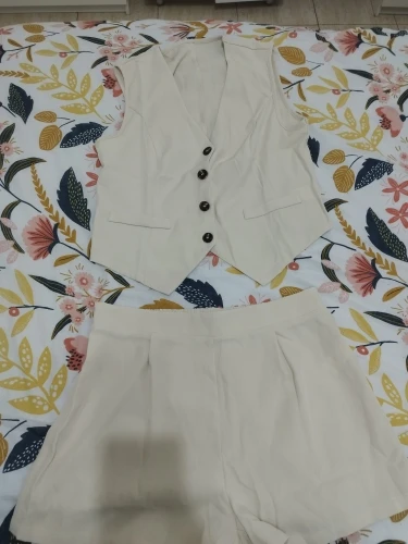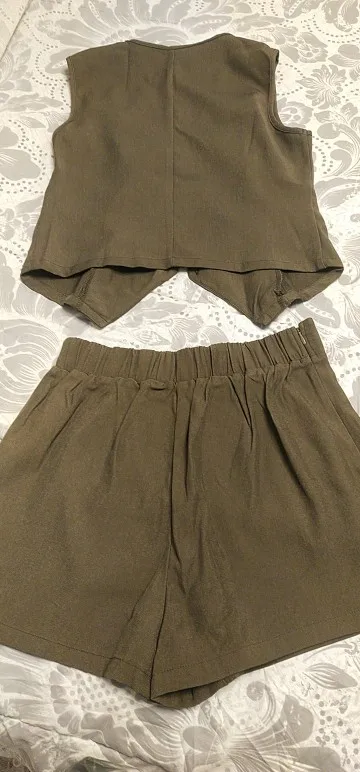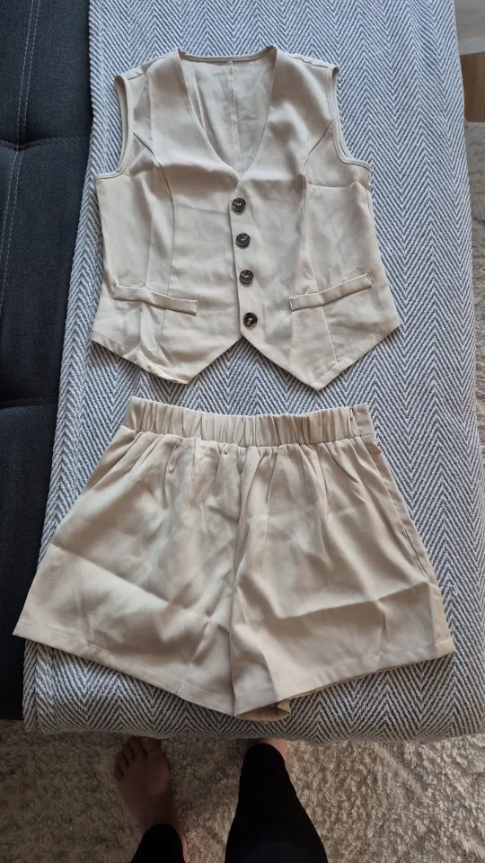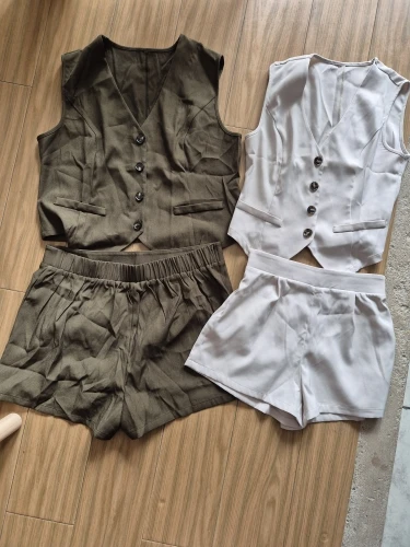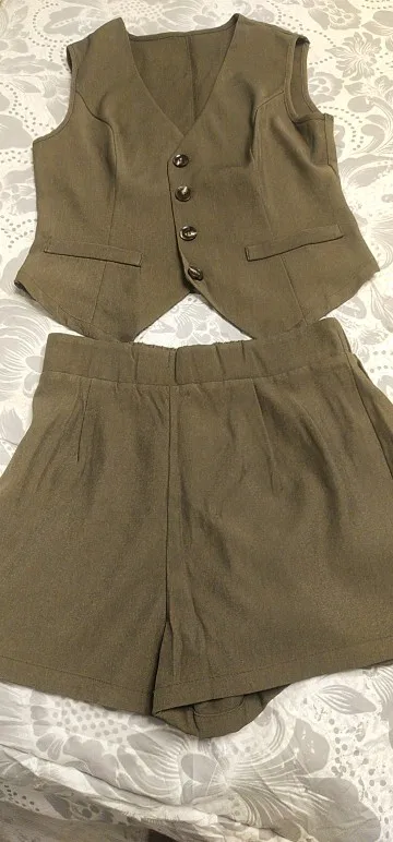 - Design: A sleeveless vest top paired with high-waisted shorts, featuring a V-neck collar and button decoration for a sophisticated touch.