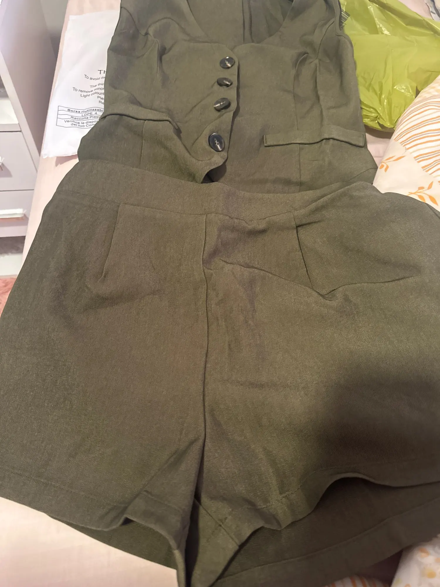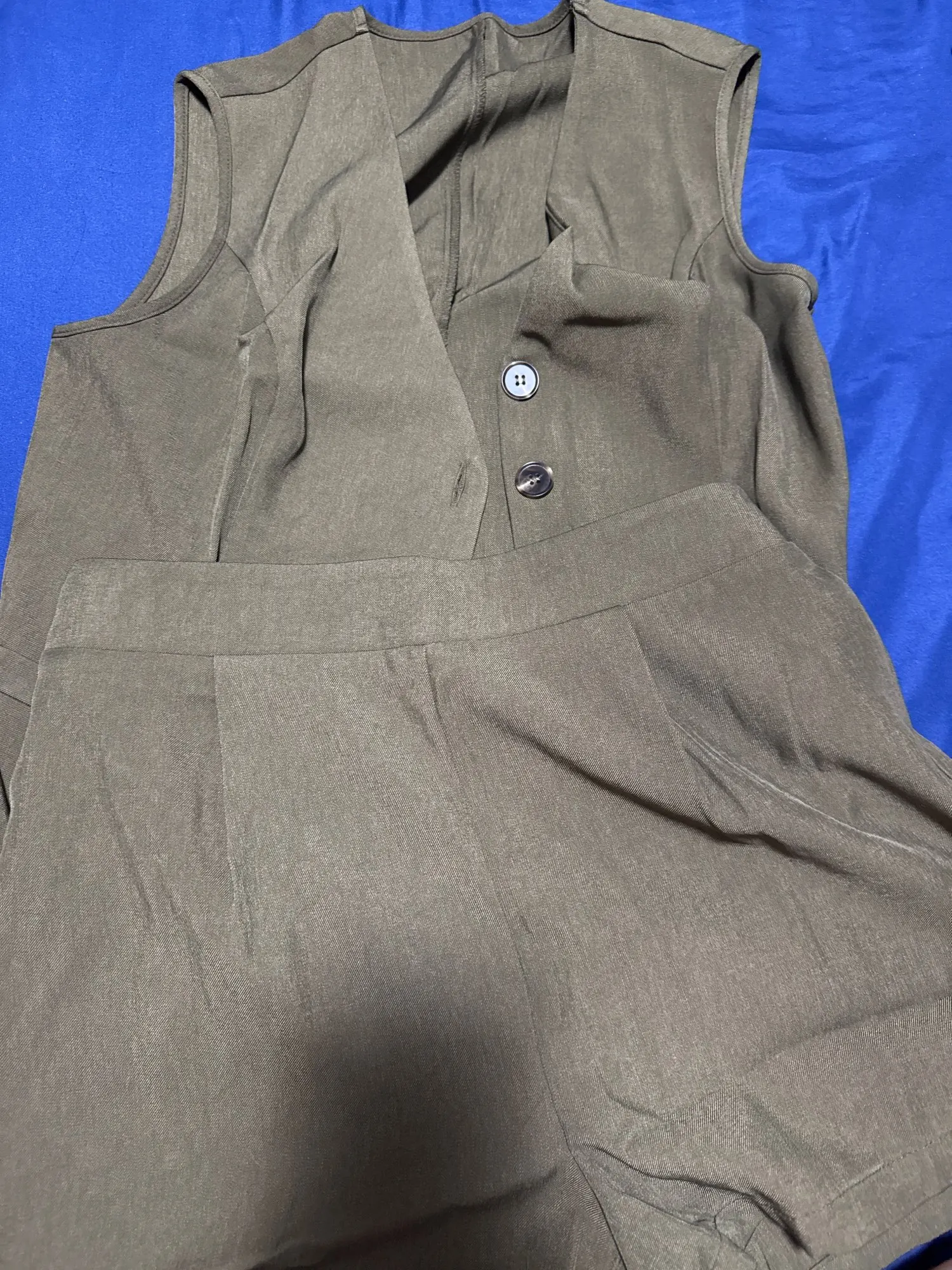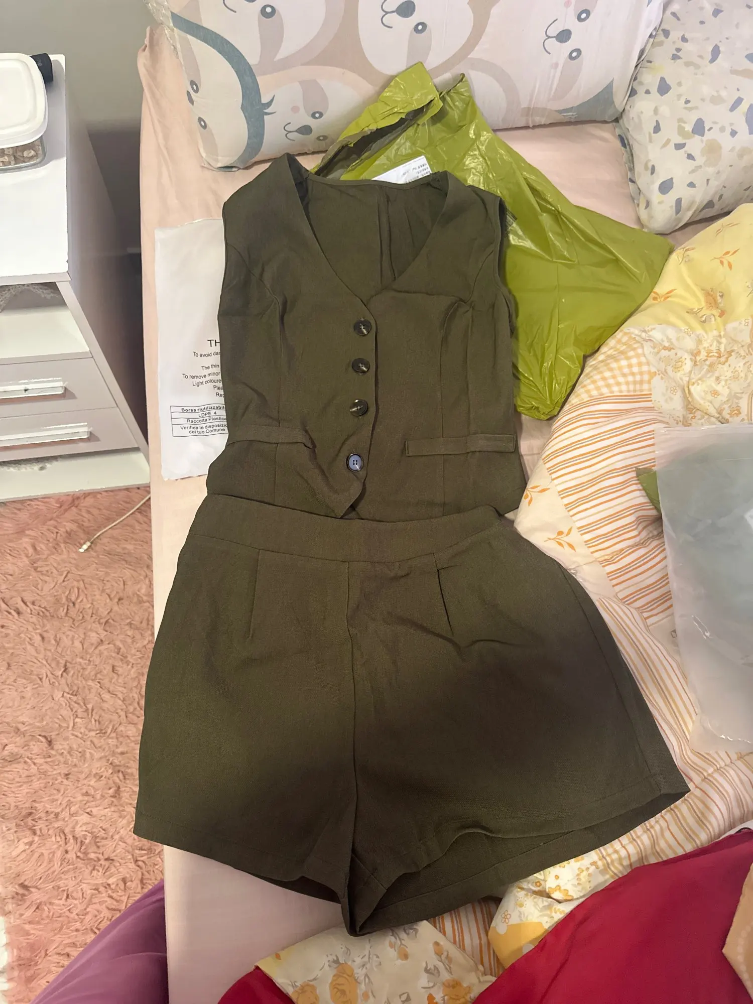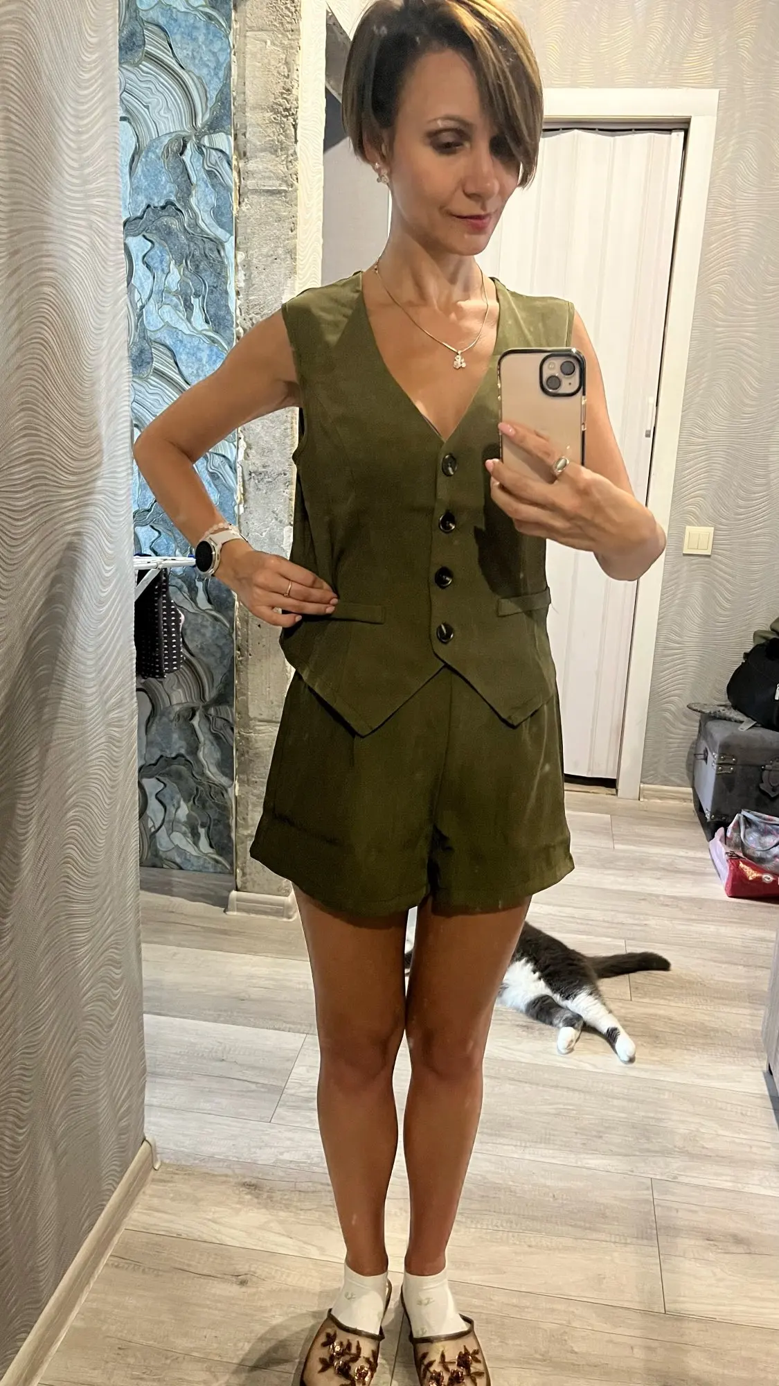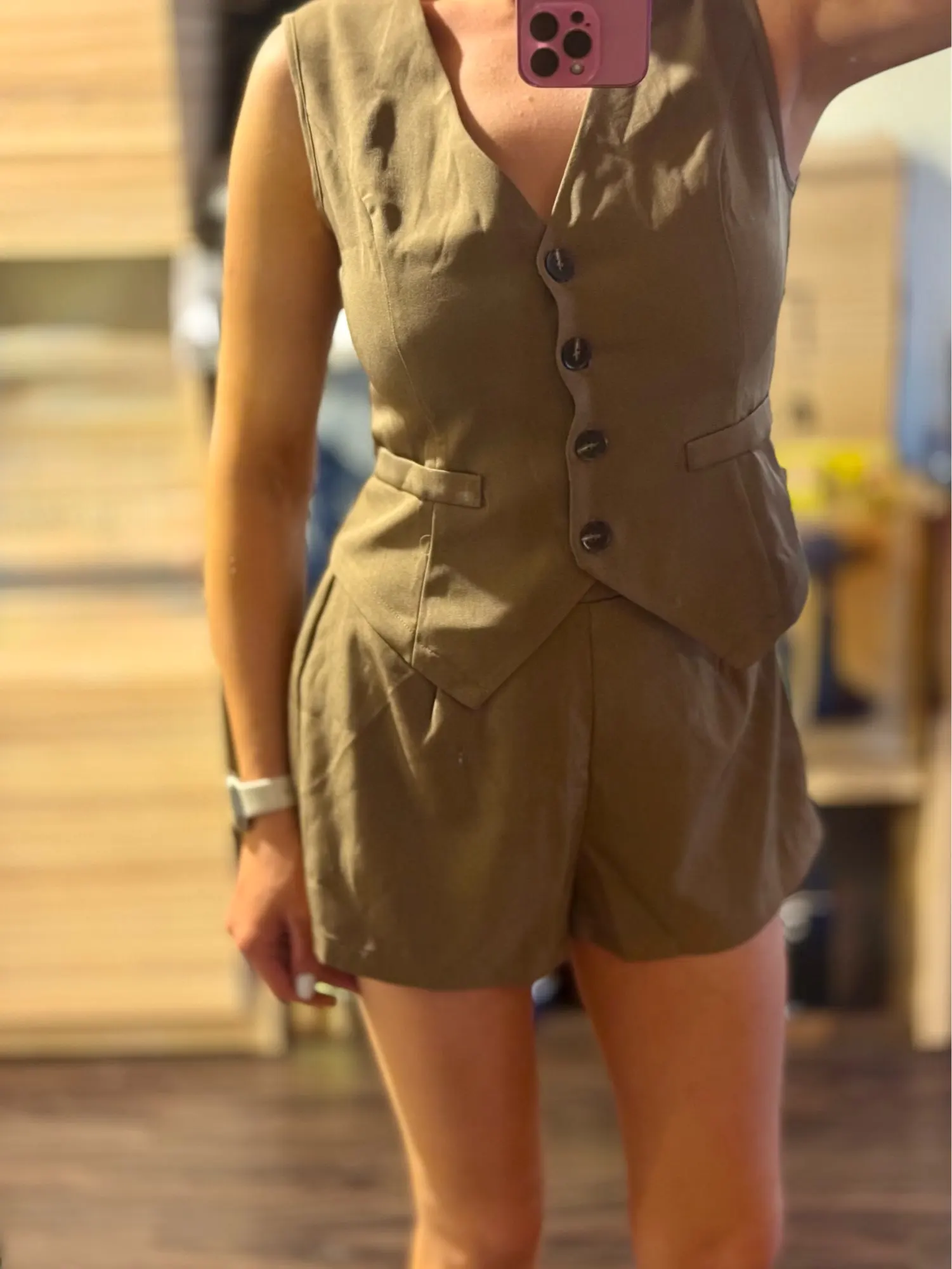 - Design: A sleeveless vest top paired with high-waisted shorts, featuring a V-neck collar and button decoration for a sophisticated touch.