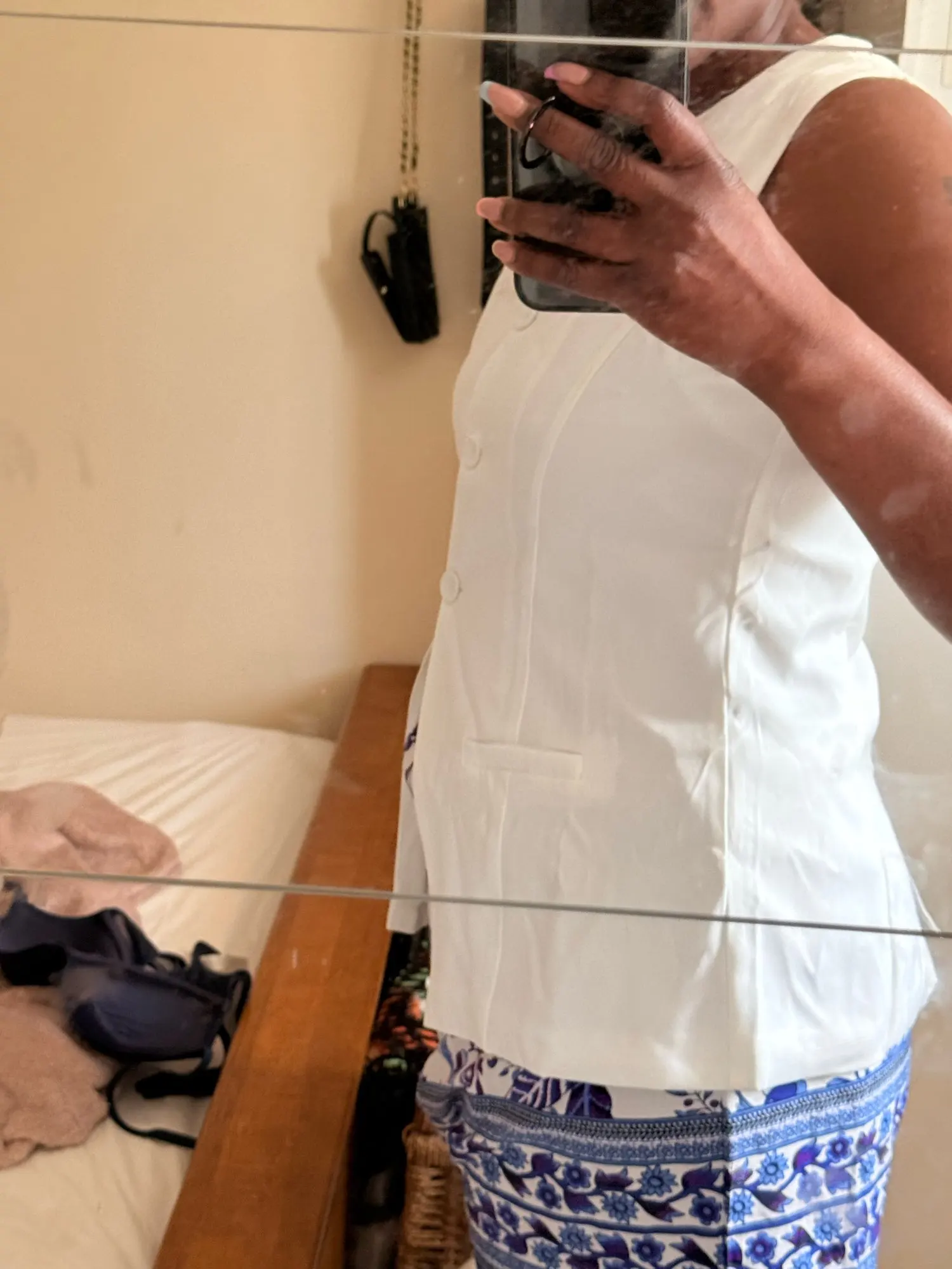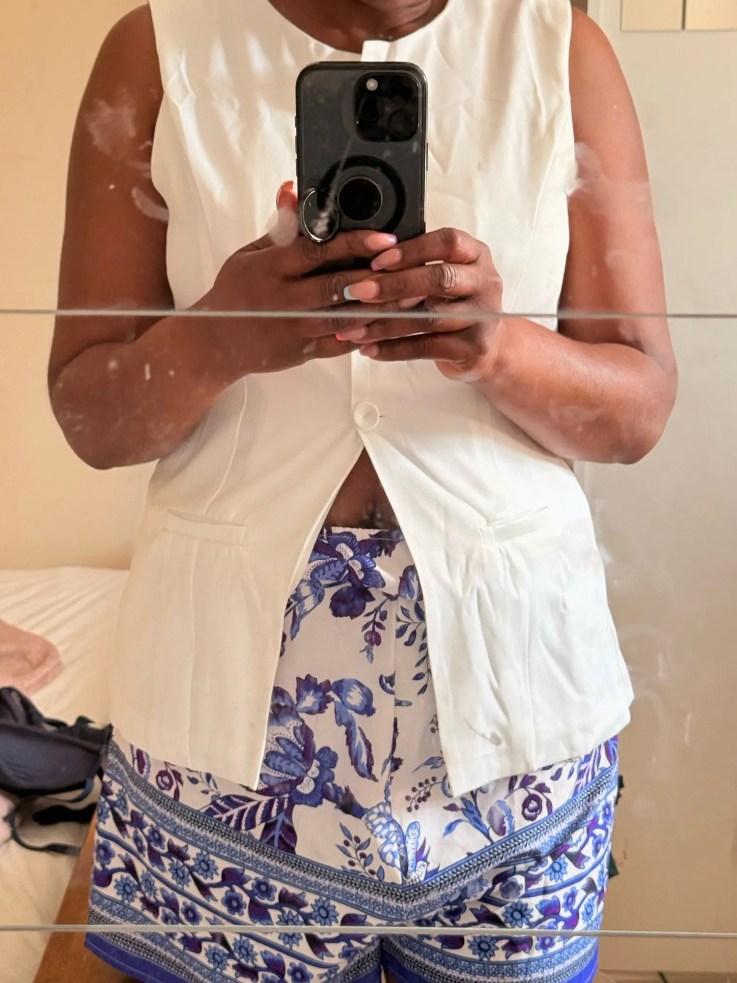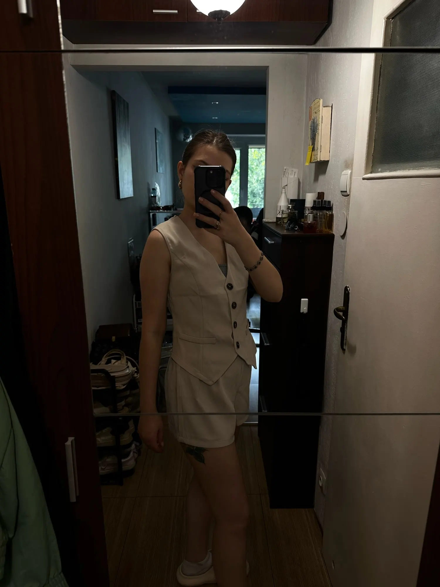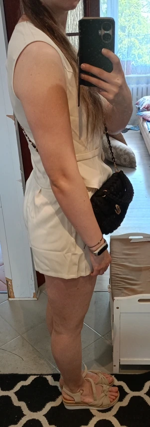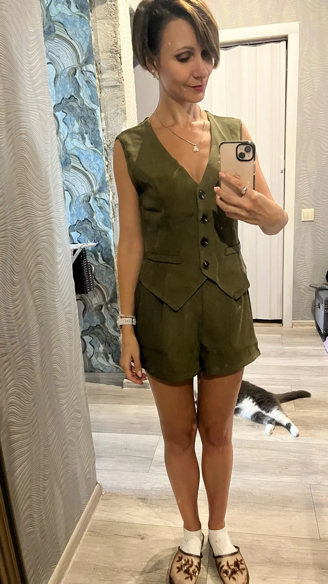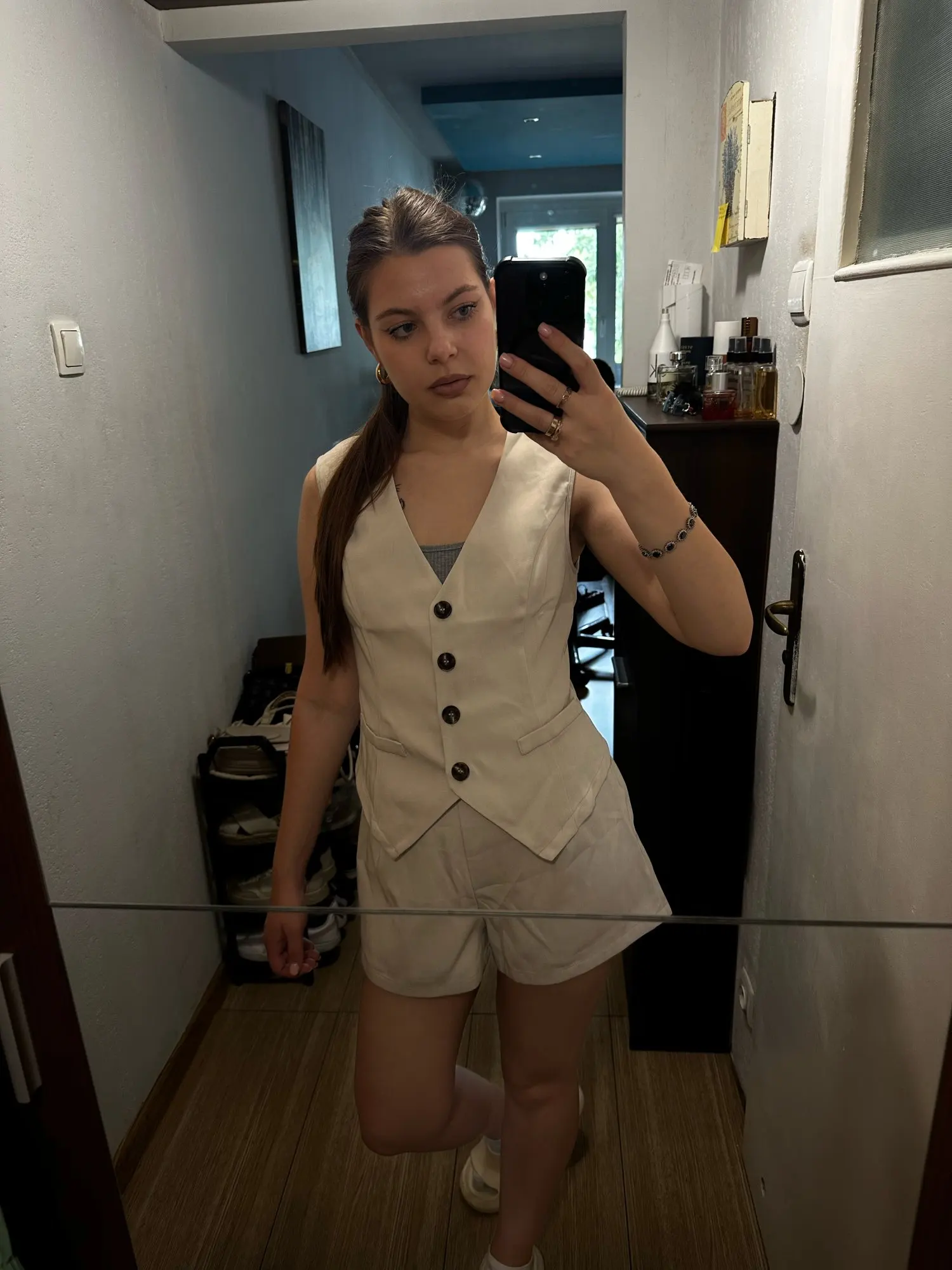 - Design: A sleeveless vest top paired with high-waisted shorts, featuring a V-neck collar and button decoration for a sophisticated touch.