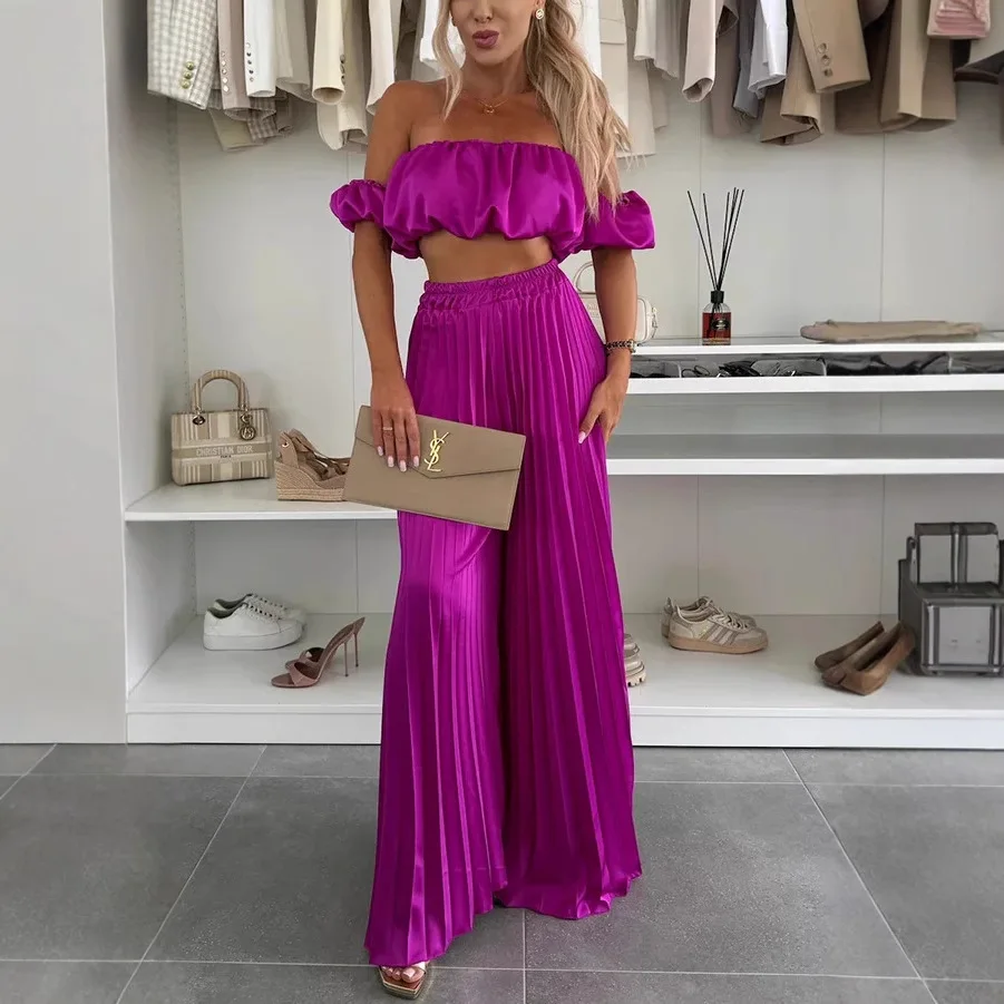 Sophisticated two-piece ensemble featuring an alluring off-shoulder top paired with flowing wide-leg pants. Crafted from premium polyester broadcloth with a streamlined silhouette that flatters every curve. High-waisted design creates an elongated look while the strapless neckline adds modern appeal. Available in six stunning colors including classic black and vibrant rose red. Perfect for office elegance or evening sophistication. Comfortable elastic waistband ensures all-day comfort in sizes S-XXXL.