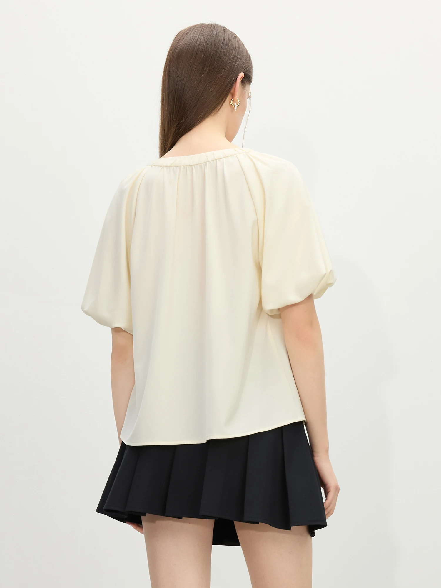 Summer Women’s Beige V-Neck Blouse with Billowy Sleeves
