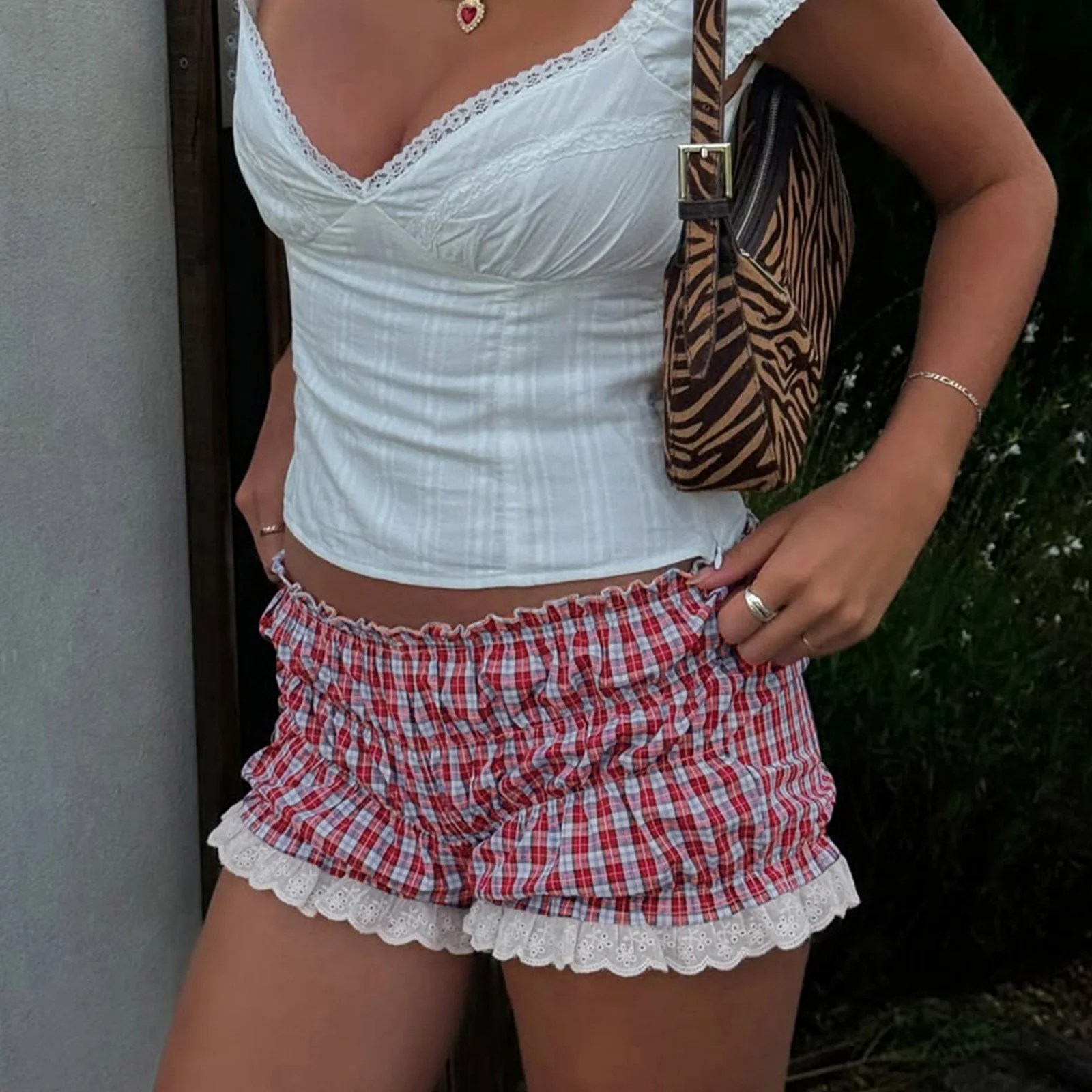 Retro Plaid Patchwork Lace Low-Rise Women’s Street Shorts