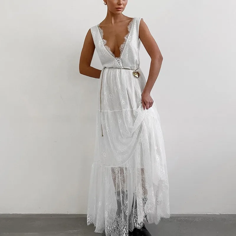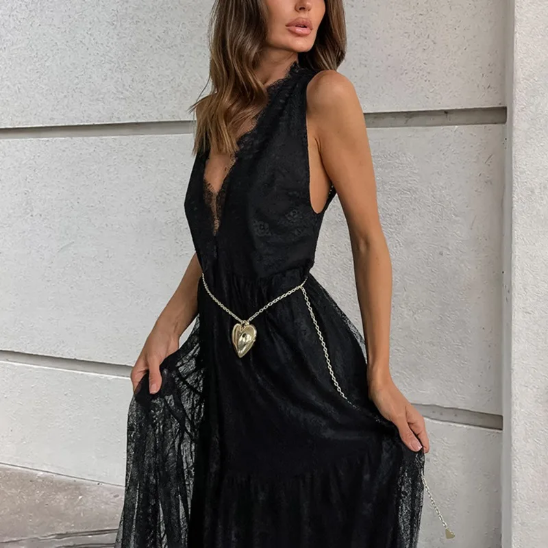 Step into elegance with this stunning black lace long dress. Featuring a captivating V-neck and backless design, this sleeveless A-line gown flows beautifully to ankle length. Crafted from high-quality polyester, its slight stretch ensures a comfortable, flattering fit. Perfect for any formal occasion, this dress exudes sophistication and style.