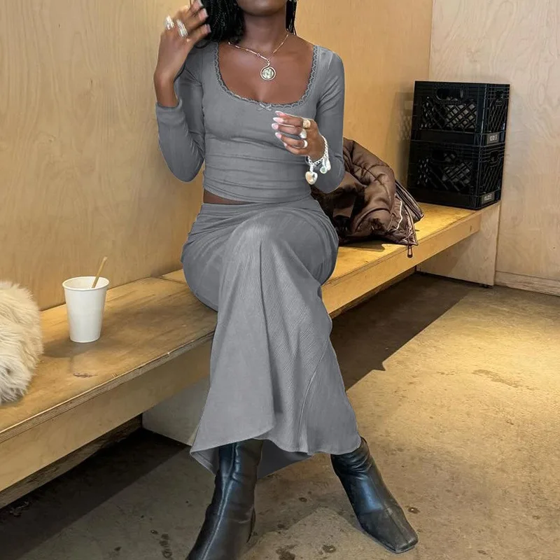 Step into sophistication with this elegant long skirt set featuring a lace long sleeve top and high waist skirt. Crafted from a luxurious blended fabric, this ankle-length ensemble offers a flattering silhouette and a comfortable elastic waist. Perfect for spring and summer, it combines casual style with refined grace. Ideal for every body, this chic two-piece set is your go-to for effortless elegance.