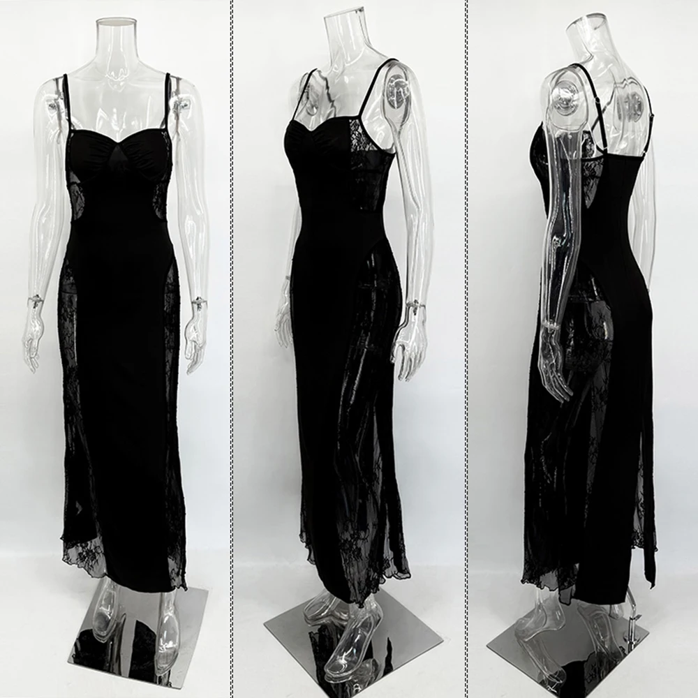 The Talenza Lace Patchwork Spaghetti Strap Maxi Dress is designed with a refined silhouette that balances subtle sensuality and modern minimalism. Crafted from a polyester and elastane blend, this dress offers a slight stretch for comfort and movement. The ankle-length cut and A-line silhouette create an elegant profile, while the delicate lace patchwork adds a tactile contrast to the smooth fabric. The natural waistline gently defines the figure without restricting wear, and the V-neckline enhances the camisole style with a sleeveless fit.