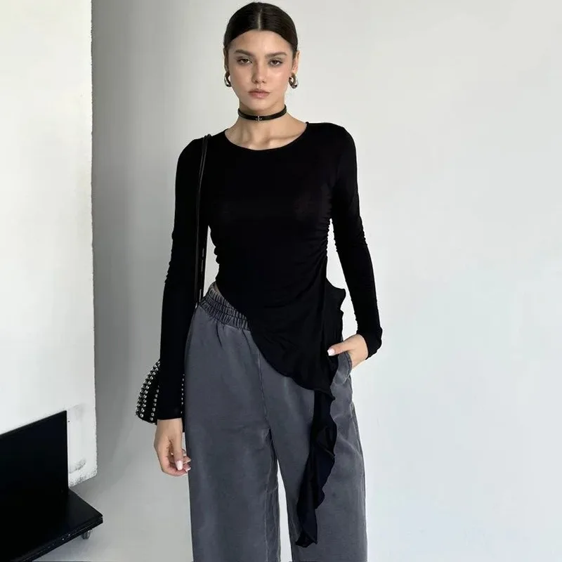 Experience effortless chic with this Ruffled High Waist T-Shirt Top. Crafted from a luxurious blended fabric, it features a flattering O-neck and full sleeves, perfect for any season. The elegant asymmetrical design adds a touch of sophistication, while the slim fit ensures a smooth silhouette. Available in classic black, white, and gray, it’s a versatile staple for your wardrobe. Embrace casual elegance today!