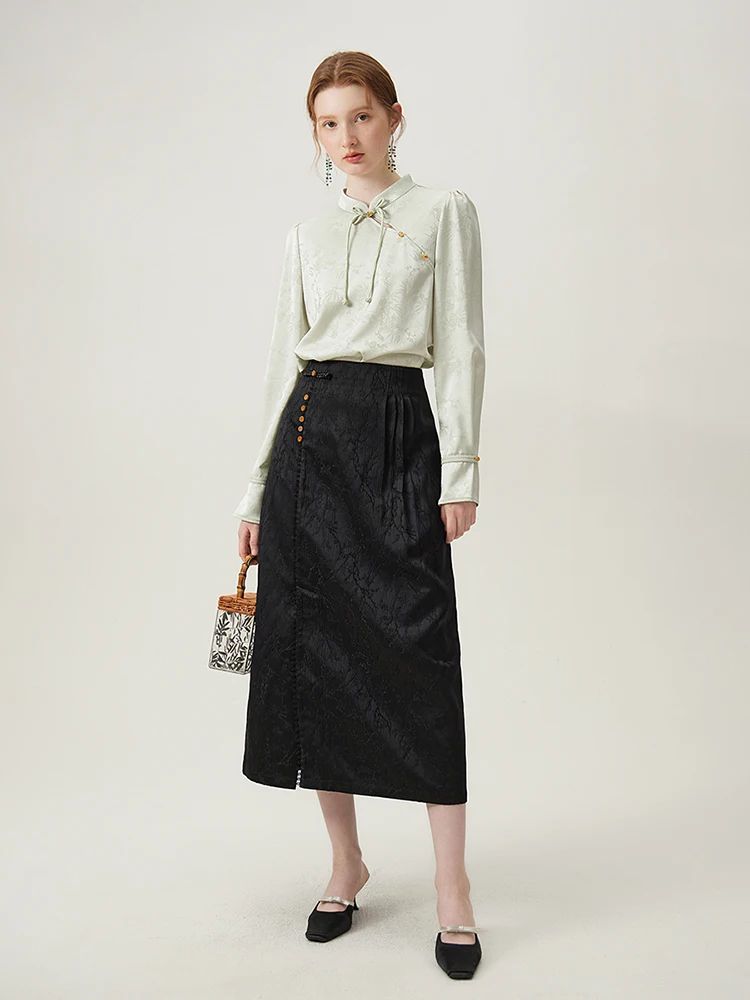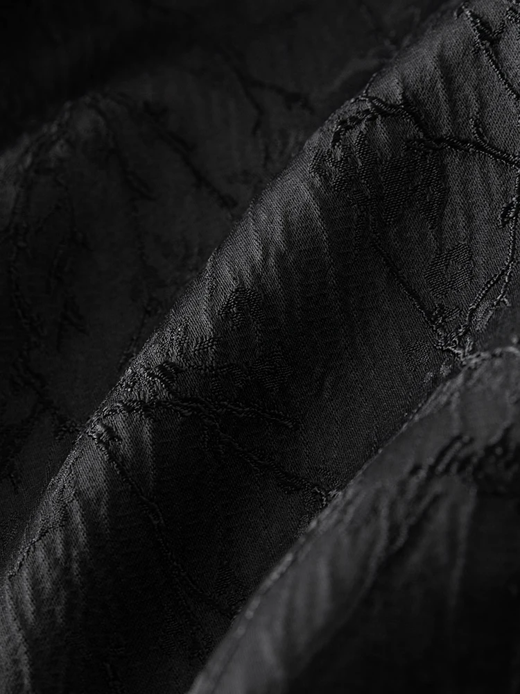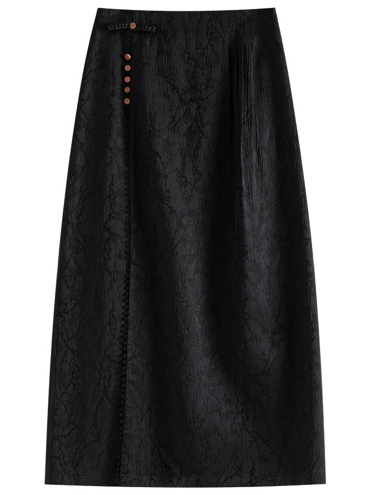 Elevate your wardrobe with the Three-Dimensional Jacquard Black Asymmetrical Midi Skirt, designed for the discerning woman who values understated elegance and refined silhouette. This midi skirt features an empire waist that gently defines the figure while its asymmetrical hem introduces a contemporary edge to classic tailoring. The black jacquard fabric presents a subtle textured pattern, adding depth and sophistication without overwhelming the minimalist aesthetic.