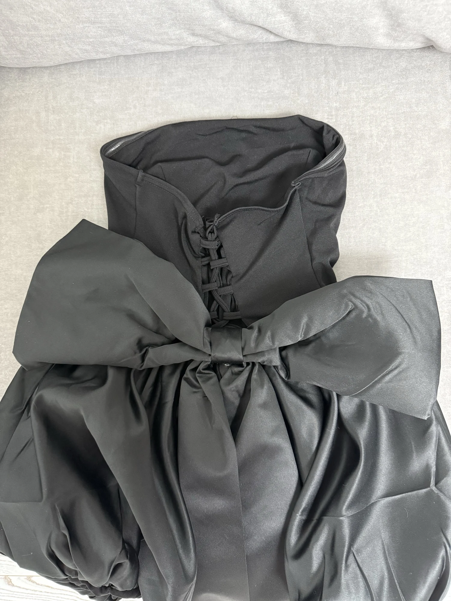 Q: What sizes are available for the Elegant Bow Backless Mini Dress?