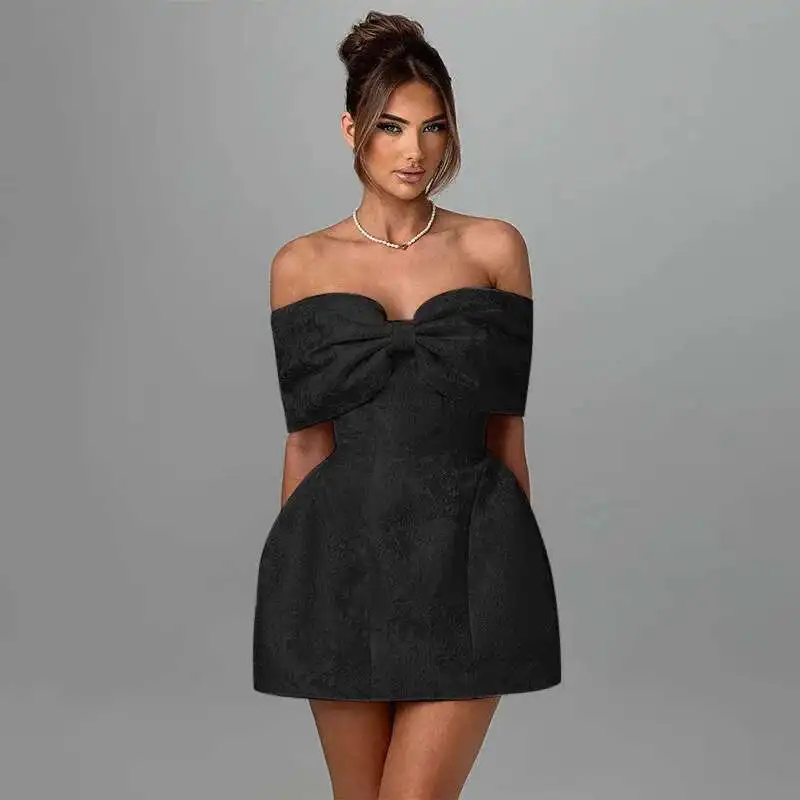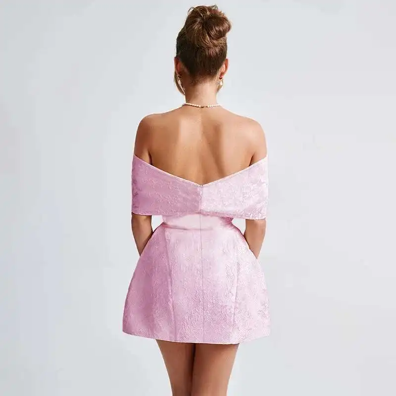 Step into sophistication with this elegant A-line dress, featuring a stunning bow back and a flattering empire waist. Crafted from luxurious jacquard fabric, it offers a chic, structured fit perfect for spring and summer parties. Available in classic black and vibrant pink, this sleeveless mini dress is your go-to for a confident, stylish look.