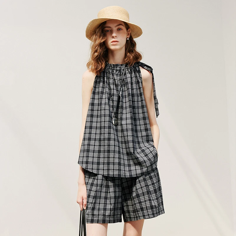 Embrace effortless elegance this summer with our Chic Black Plaid Blouse. Crafted from a luxurious cotton-microfiber blend, this midweight, sleeveless top features a sophisticated plaid pattern that exudes timeless style. Designed for a relaxed fit, it seamlessly transitions from office to evening, ensuring you look effortlessly polished. Available in multiple sizes, this blouse is a must-have for your summer wardrobe.