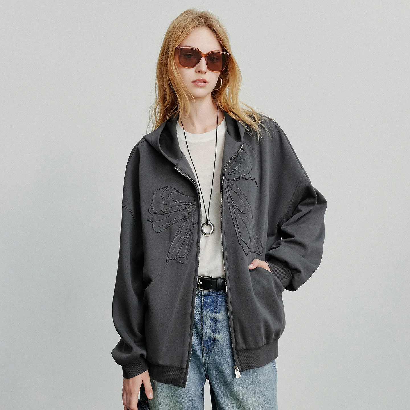 TOYOUTH Women Hooded Sweatshirt Autumn New Bowknot Zipper Closure Sport Casual Cardigan Jacket Dark Gray