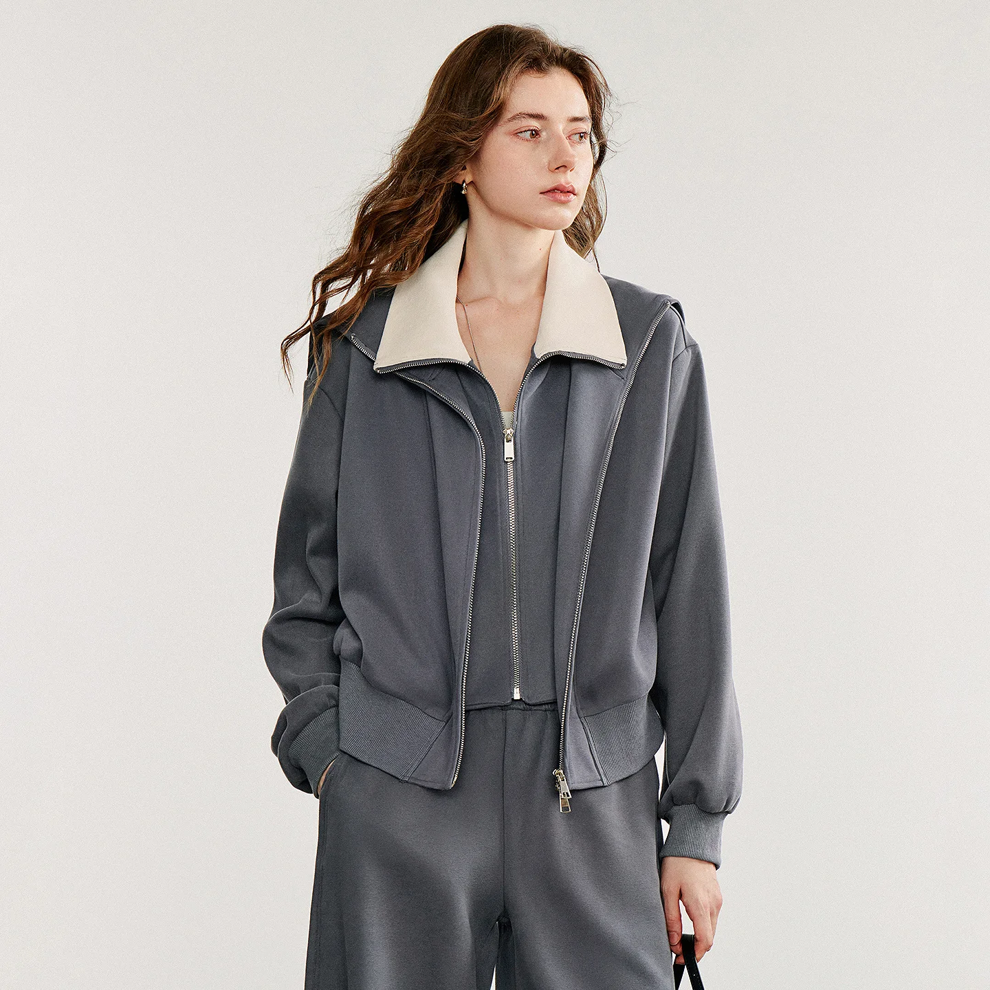 TOYOUTH Women Jacket Coat Autumn New Short Style Contrasting Color Stand Up Collar Fake Two Piece Cotton Outwear Jacket