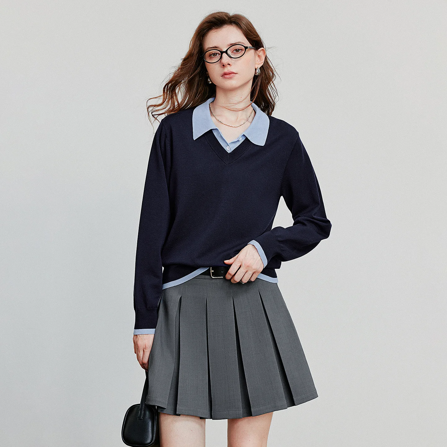 - Style: Preppy with a turn-down collar and full sleeves