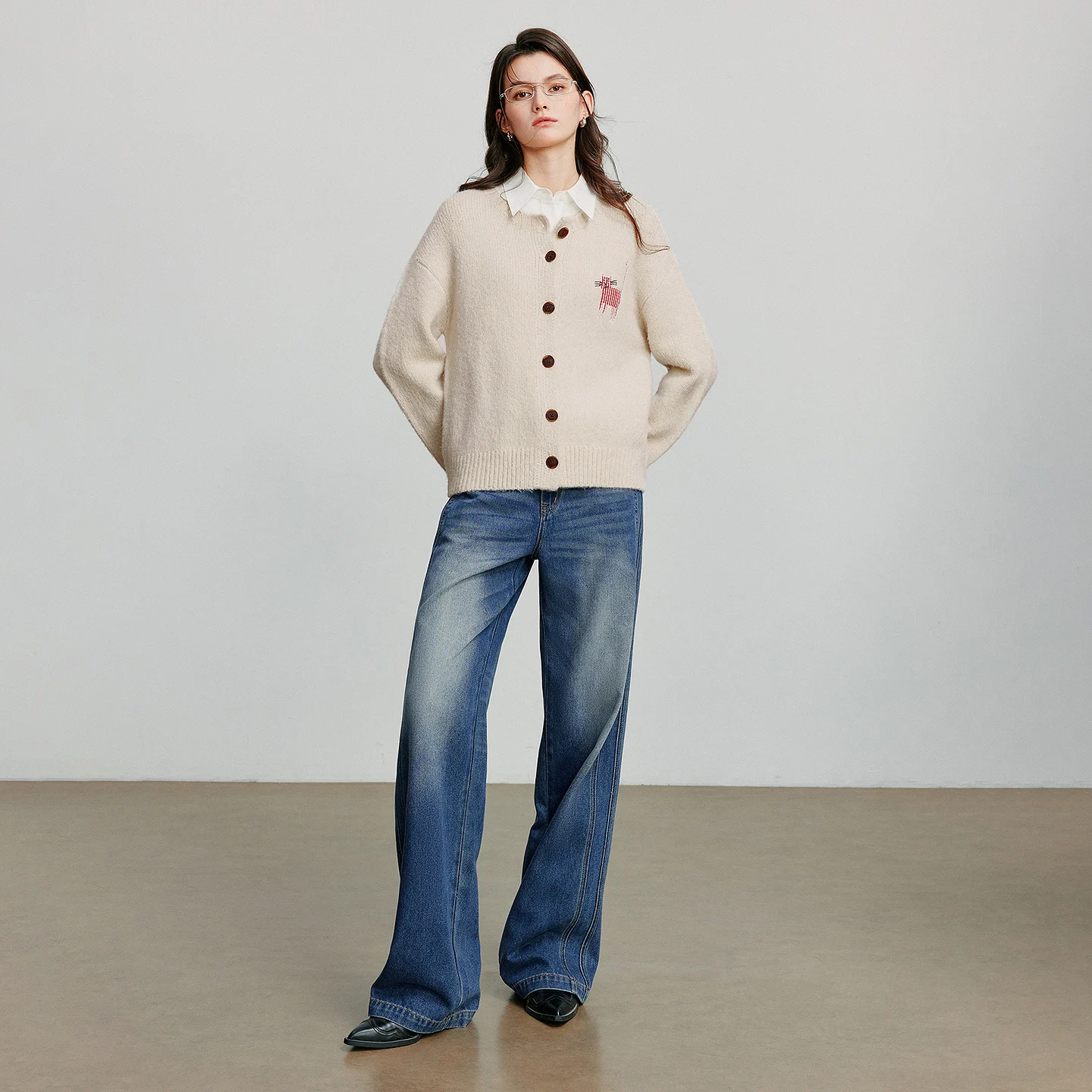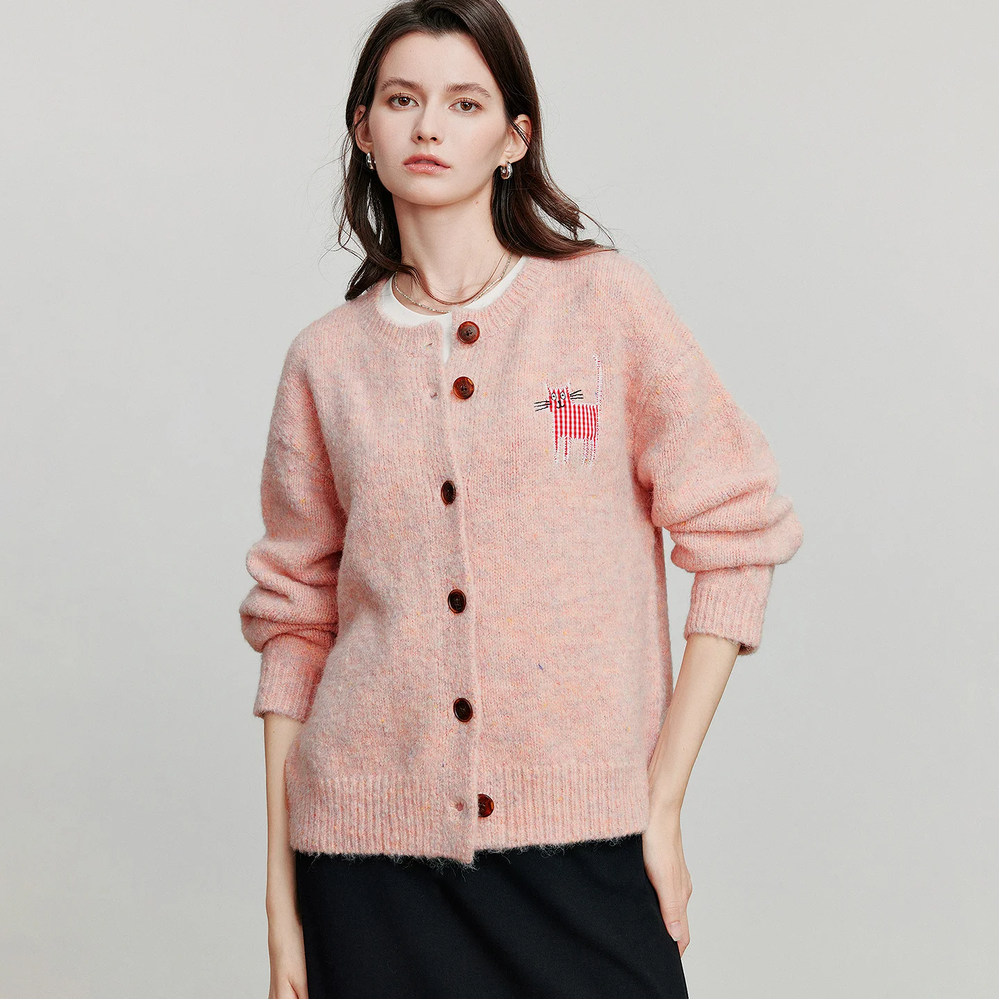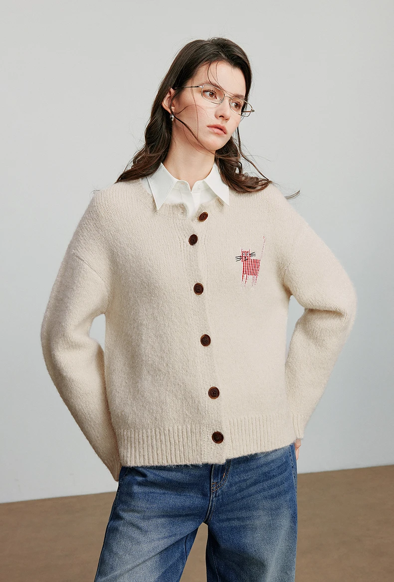 TOYOUTH Women Knitted Sweater Autumn New Cat Patchwork Embroidered Single Breasted Button Wool Cardigan Tops