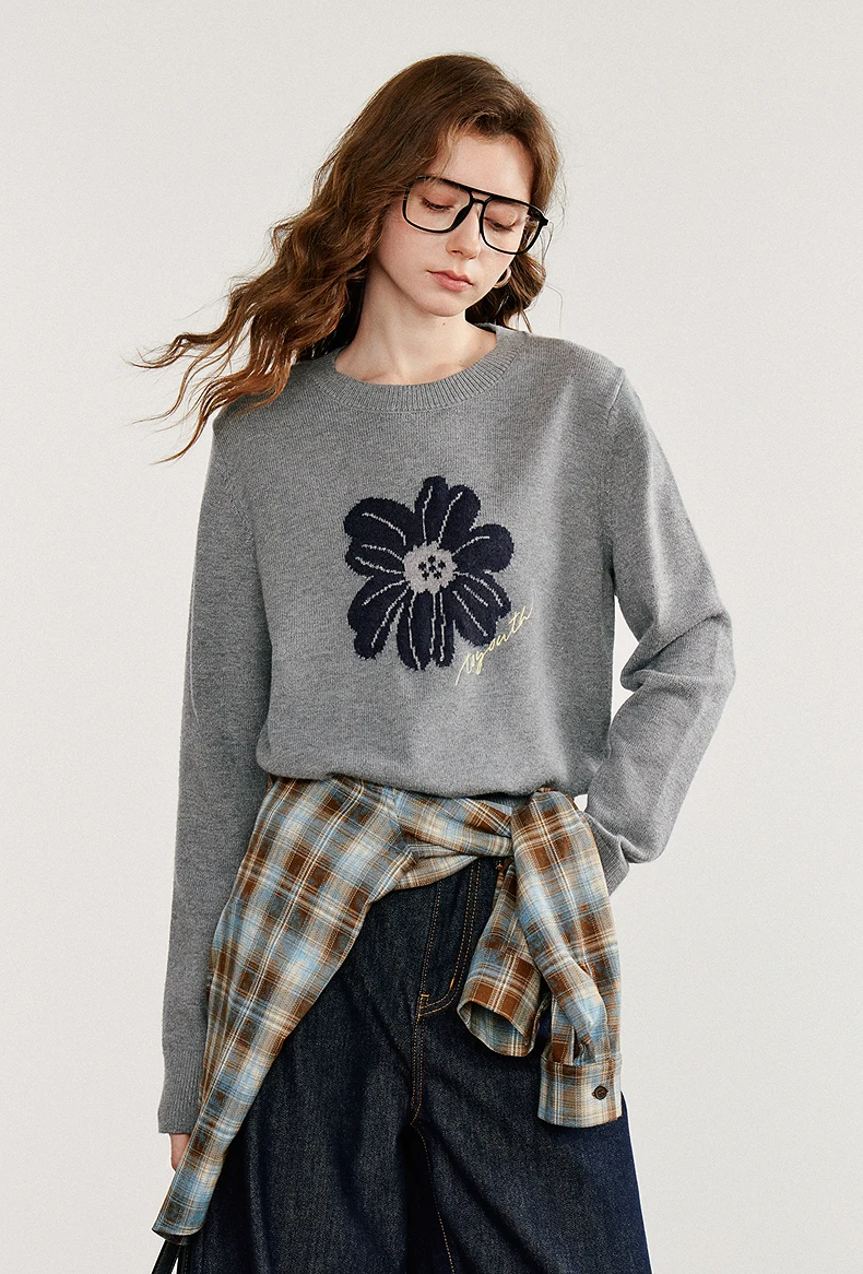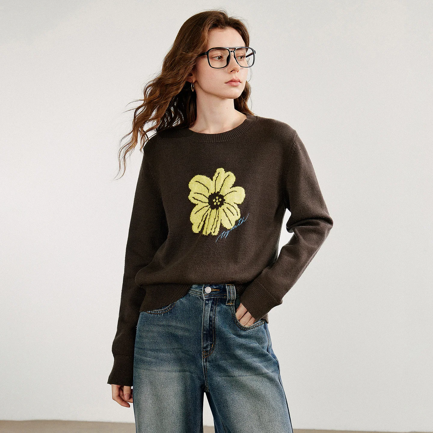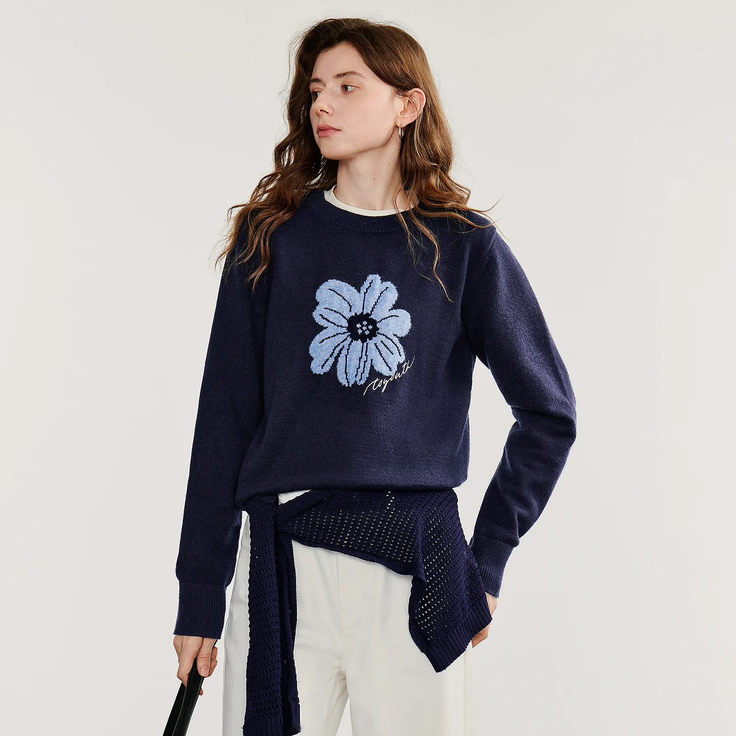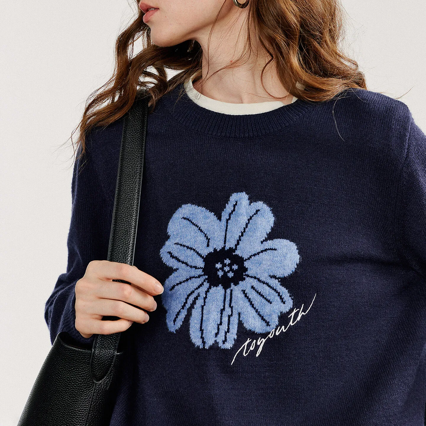TOYOUTH Women Knitted Sweater Autumn New Countryside Style Flower Jacquard Long Sleeve Round Neck Pullover Tops