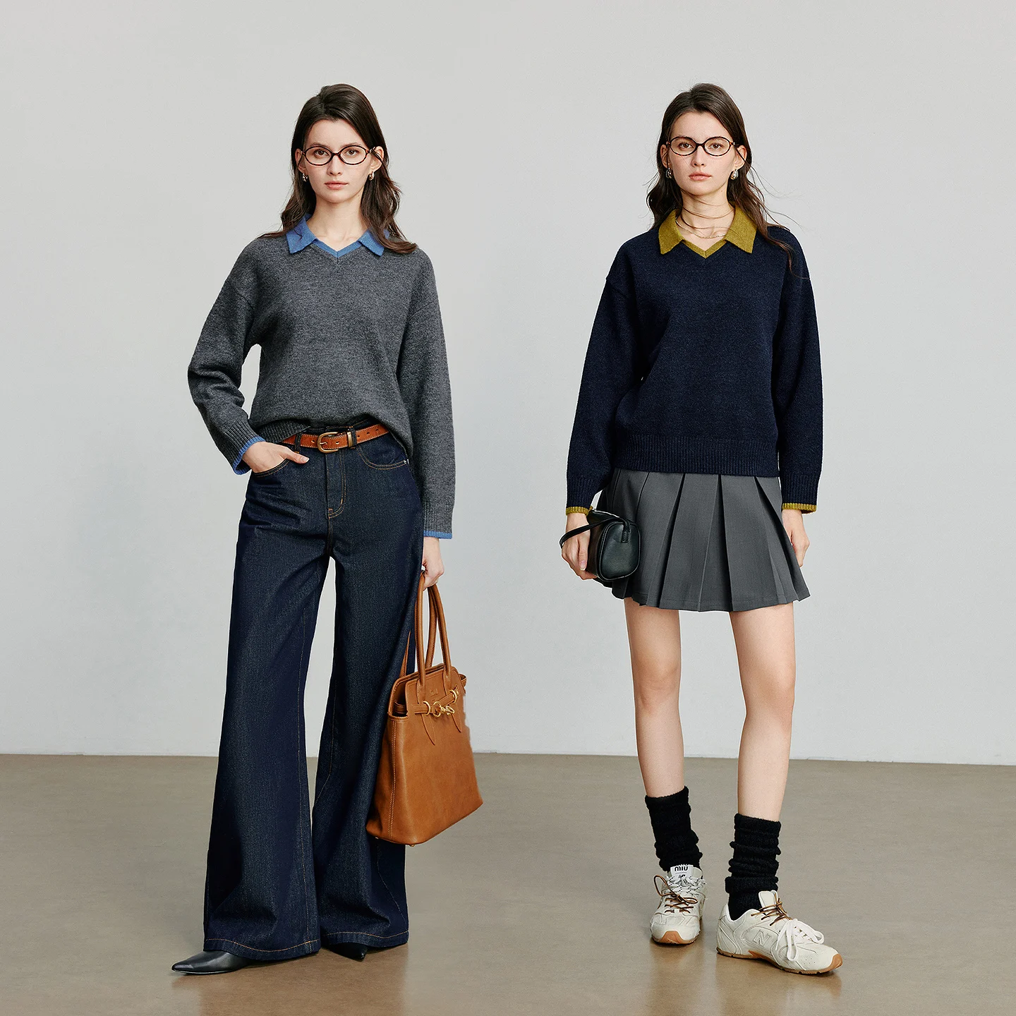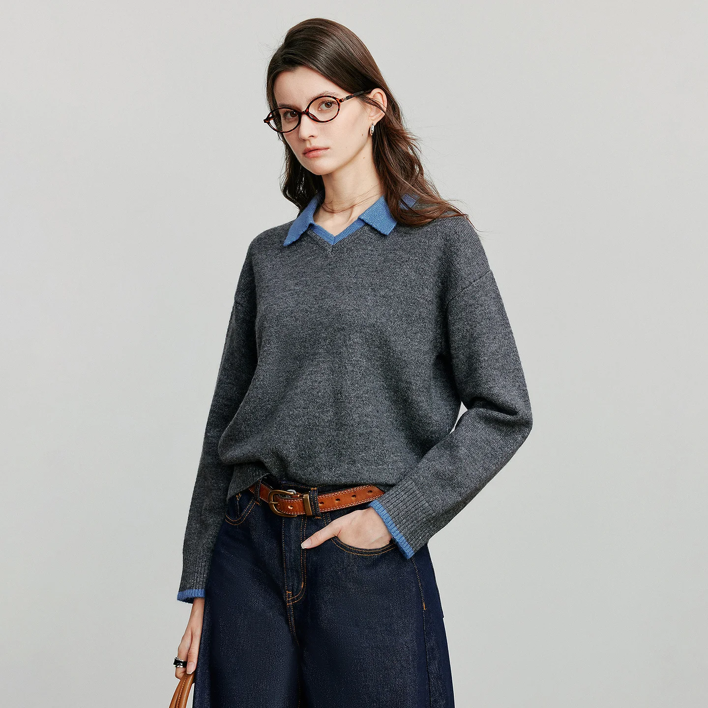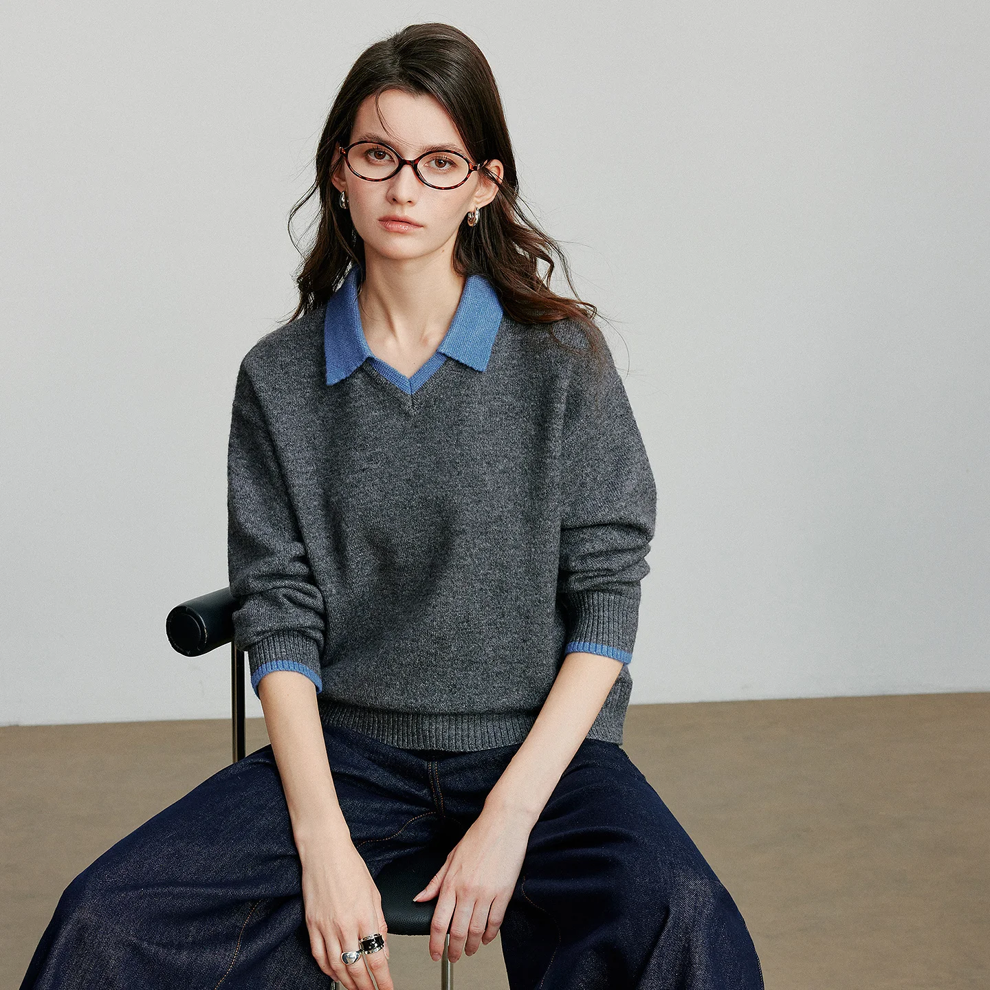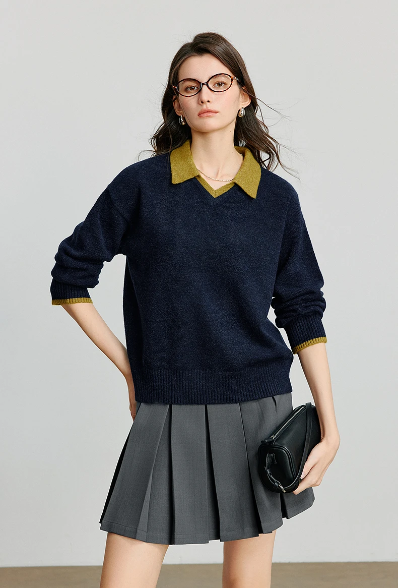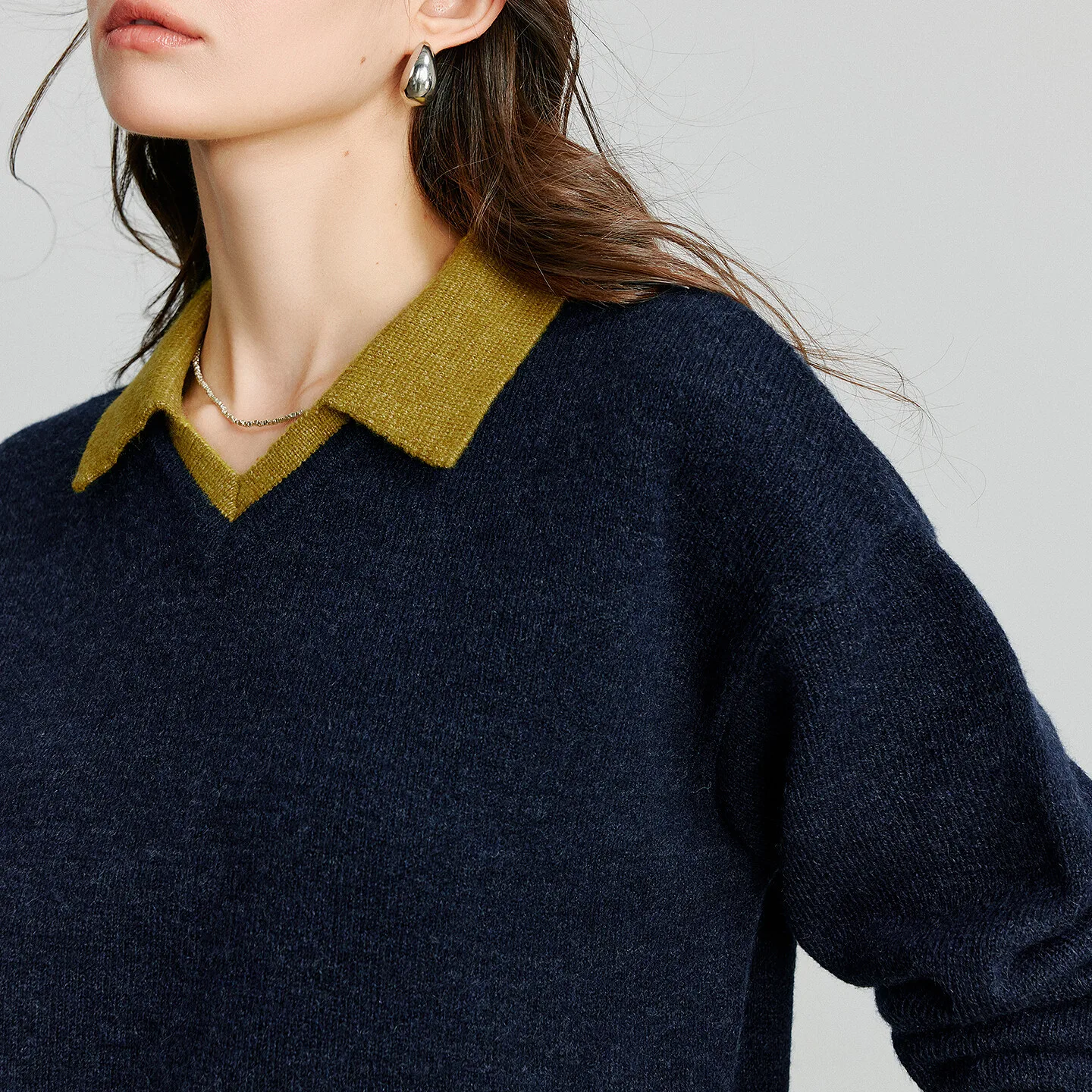 TOYOUTH Women Knitted Sweater Autumn New Match Color Splicing Long Sleeve Turn Down Collar Pullover Tops