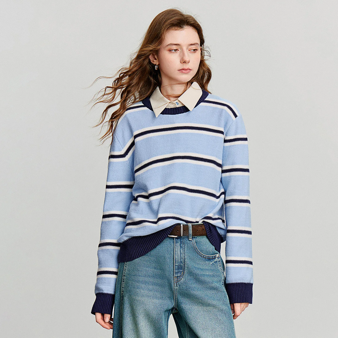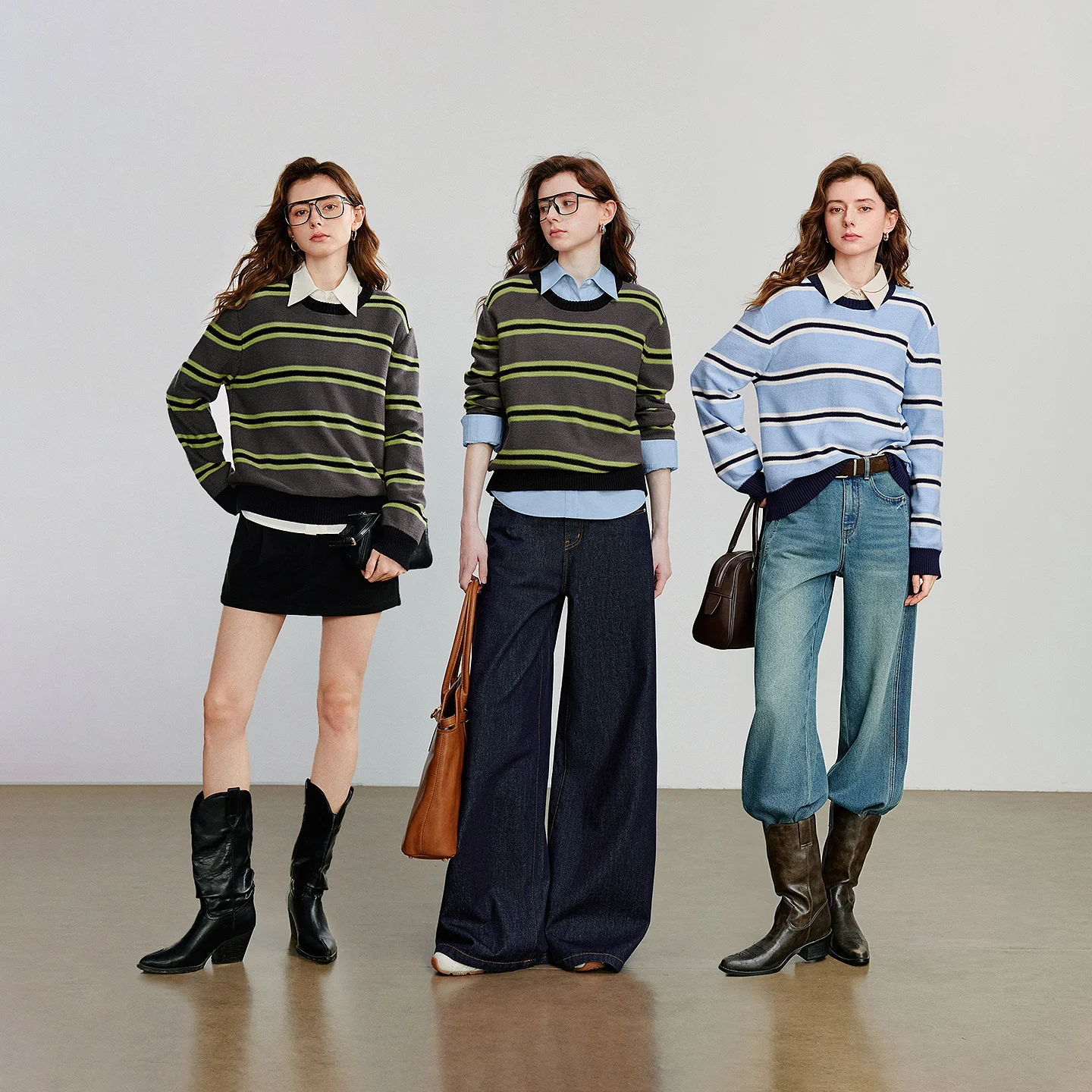 TOYOUTH Women Knitted Sweater Autumn New Vintage Striped Long Sleeve Round Neck Woolen Pullover Tops