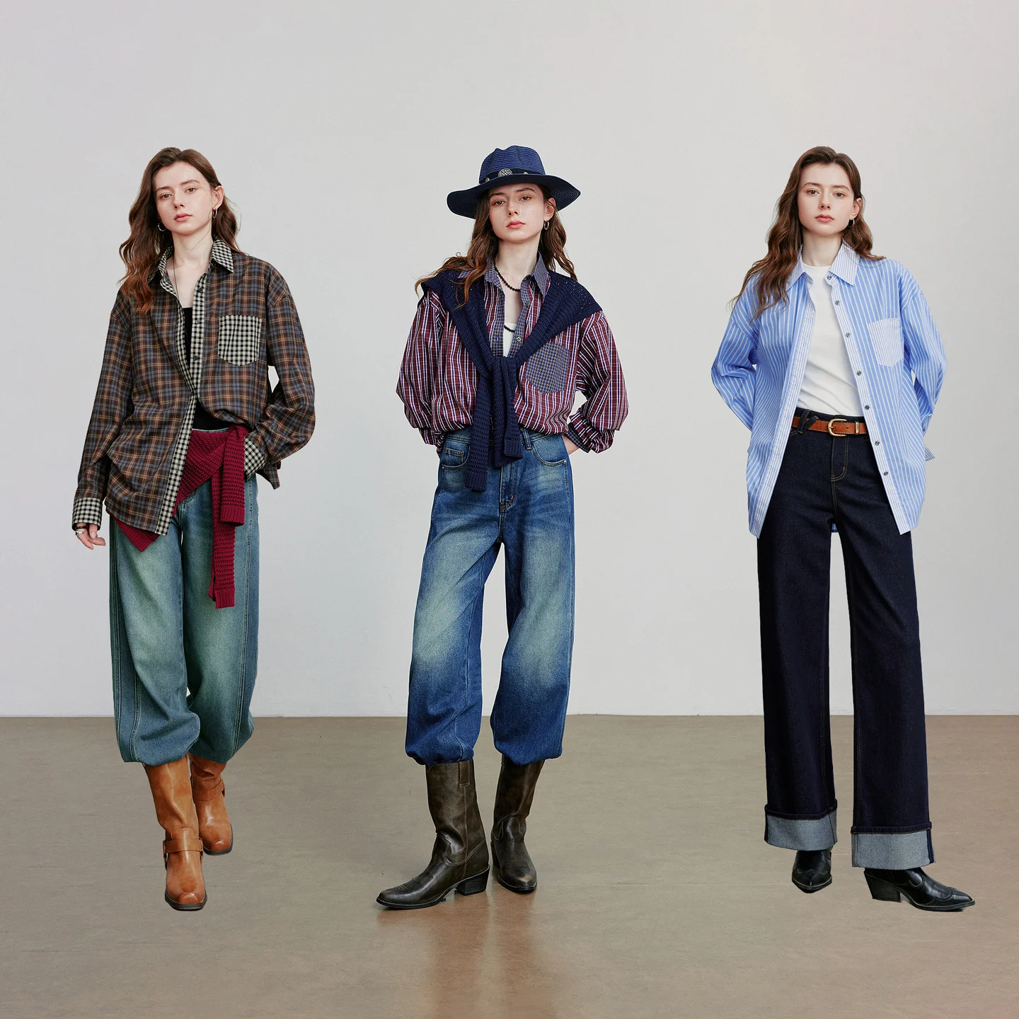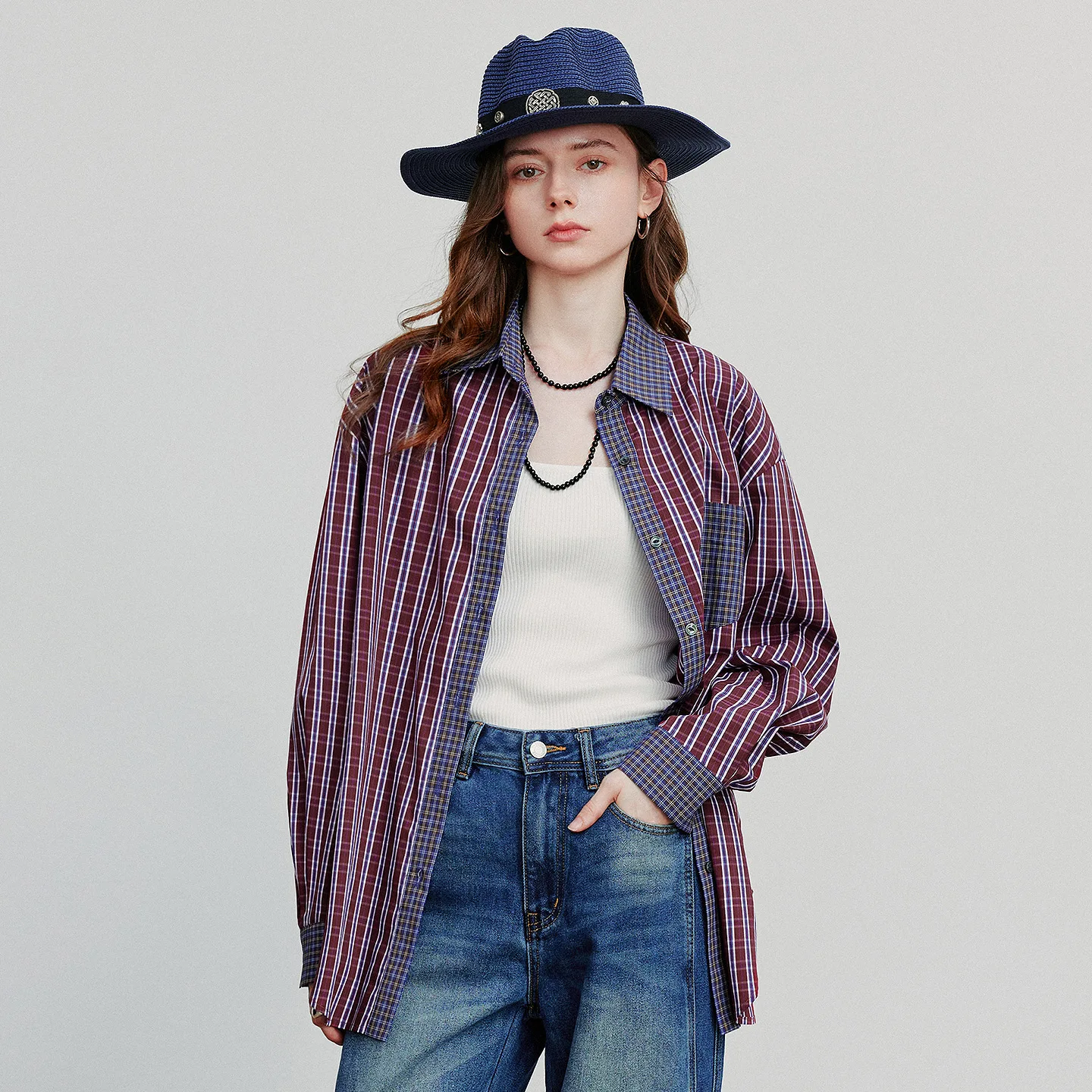 TOYOUTH Women Long Sleeve Blouse Shirt Autumn New Striped Splicing Irregular Grid Simple Shirt Tops