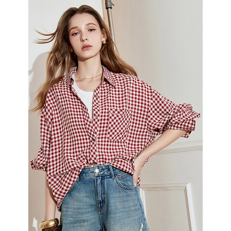 Step into sophistication with this Retro Cotton Plaid Long Sleeve Blouse, crafted from a luxurious blend of viscose and polyester. The midweight fabric drapes beautifully, while the turn-down collar and open stitch closure add a touch of elegance. Perfect for office or casual outings, this blouse offers a relaxed fit for all-day comfort. Available in classic brown and true red, it embraces the essence of spring/summer fashion. Designed for every body, this blouse is a timeless addition to your wardrobe.