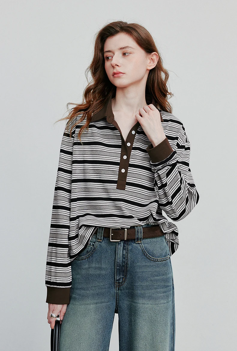 TOYOUTH Women Long Sleeve T-shirt Autumn New Striped Turn Down Collar Contrasting Casual Pullover Tops
