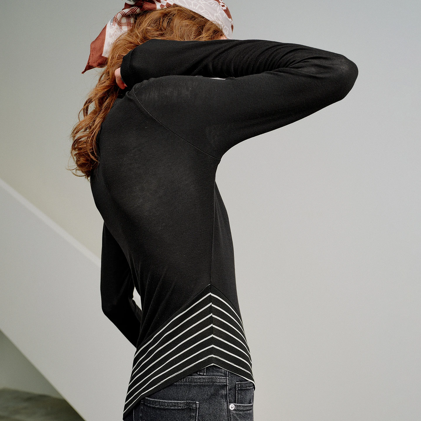 Designed with a flattering slim fit and true-to-size cut, this top features a sophisticated black hue accented by a chic striped pattern and unique patchwork details. The asymmetrical hem adds a contemporary edge, making it perfect for both professional and casual settings.