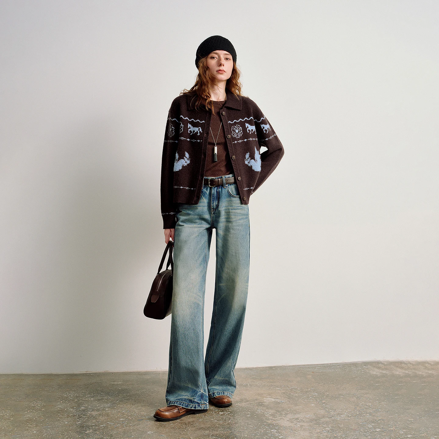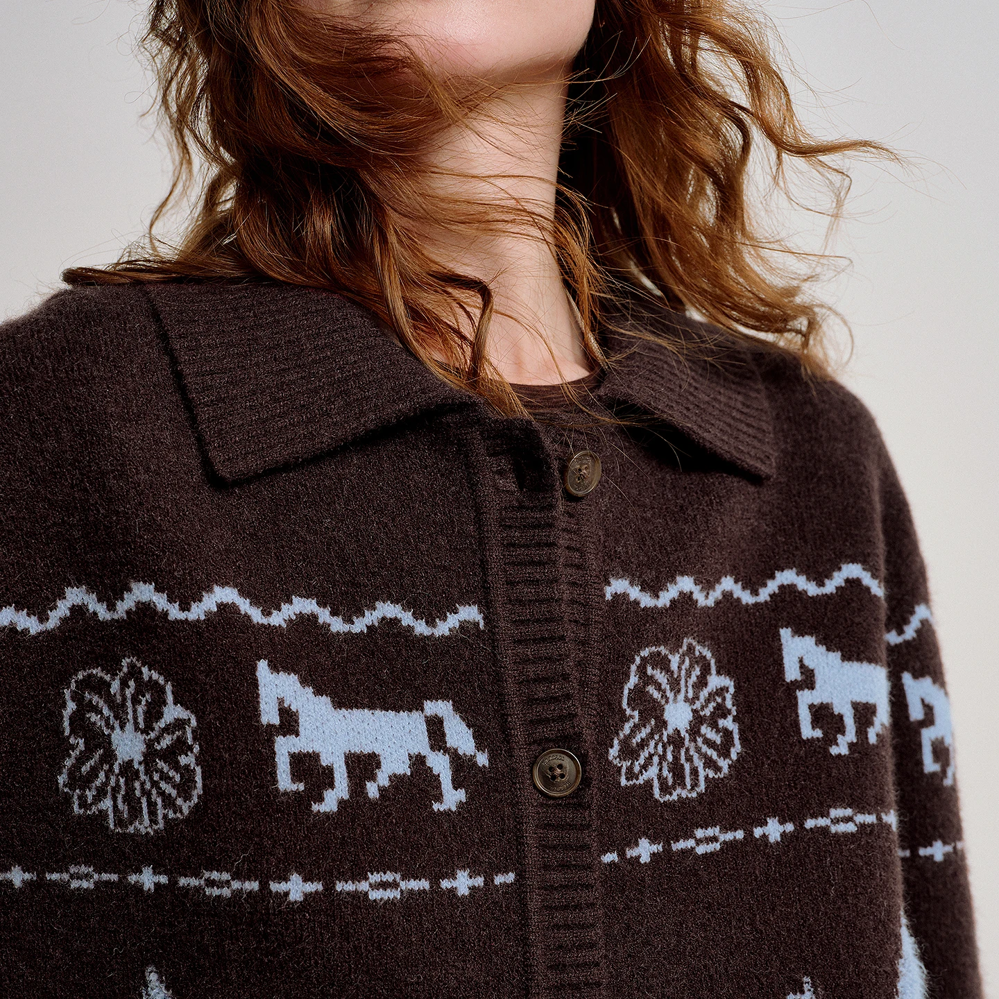 Crafted from a soft blend of microfiber, polyester, and nylon, this medium-weight cardigan provides warmth without bulk. The rich brown base accented with a vintage green jacquard pattern adds a unique, artistic touch that elevates any outfit.