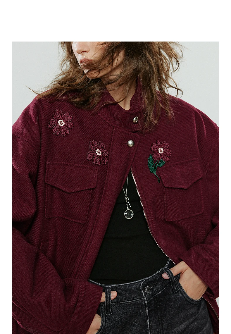 Chic Burgundy Floral Embroidered Winter Jacket for Women