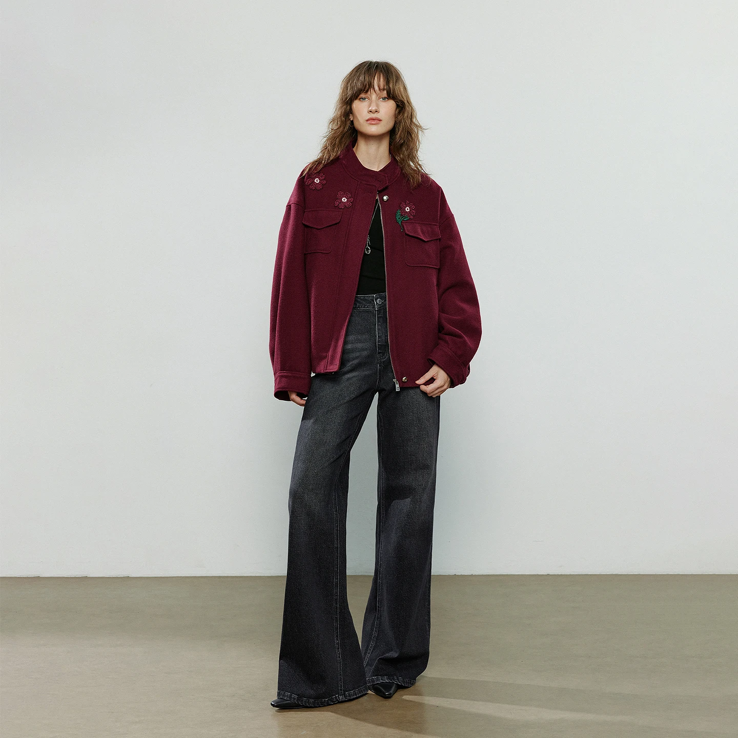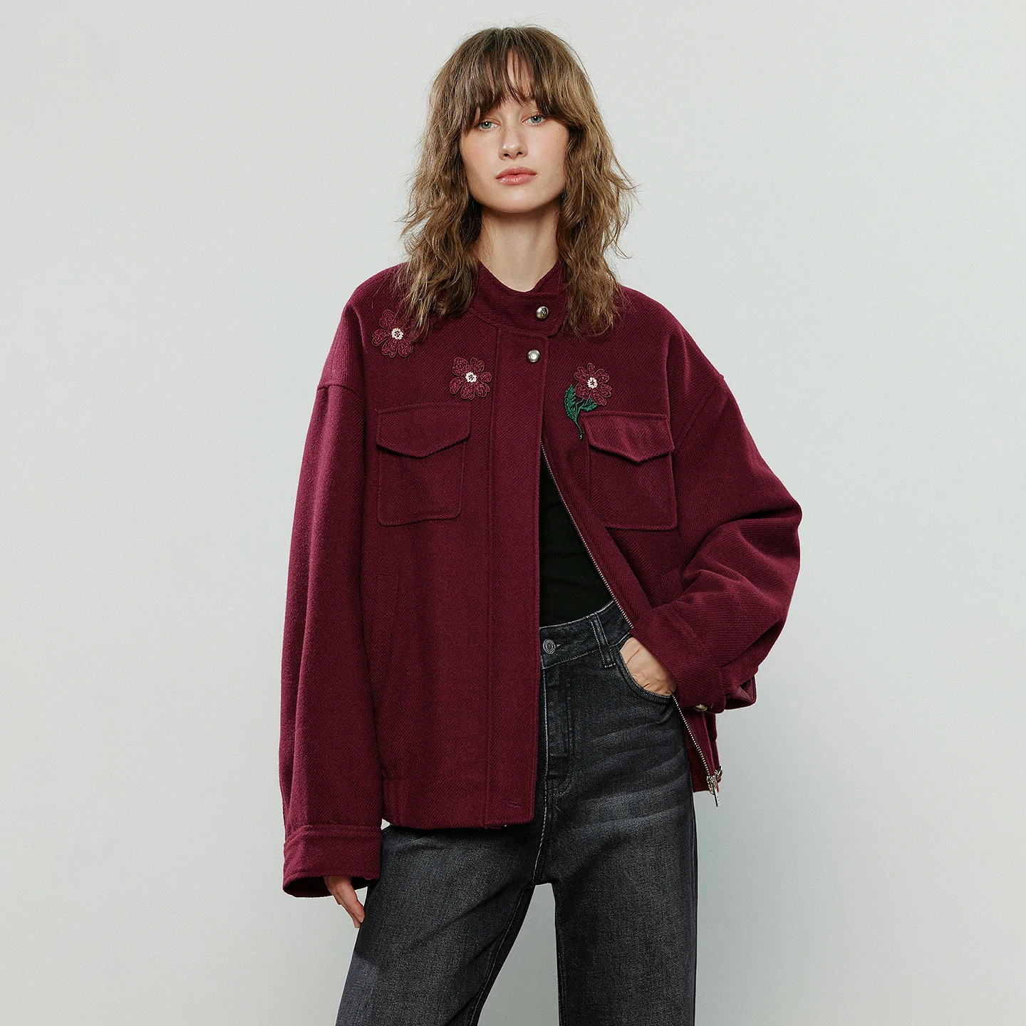 Burgundy Floral Embroidered Zip Jacket – Elegant Winter Coat