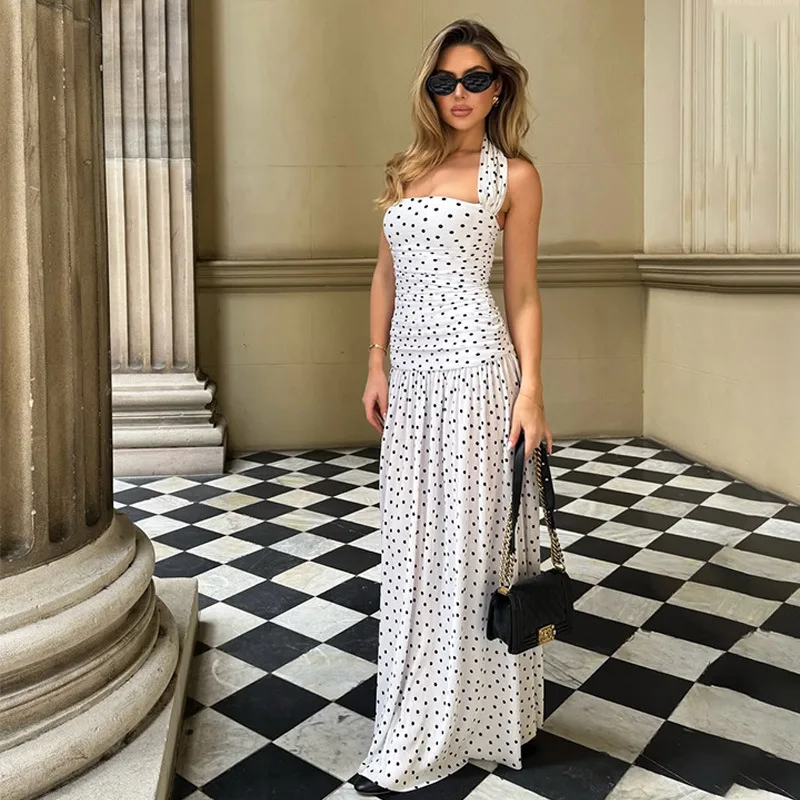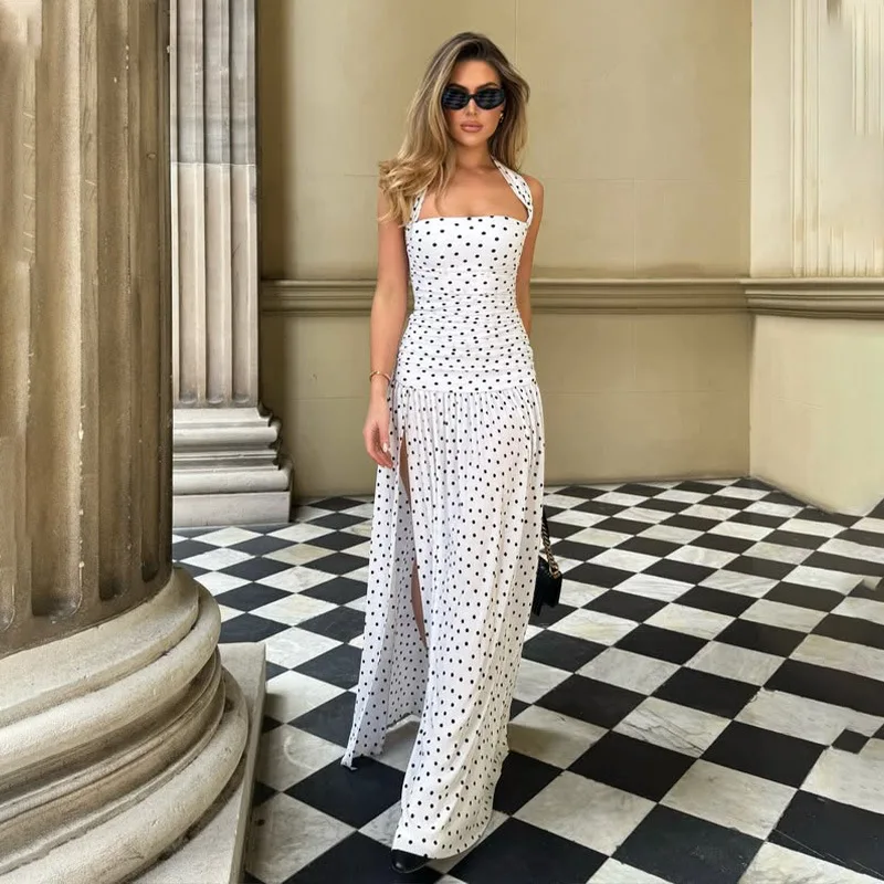 Step into sophistication with this elegant polka dot long dress, designed for the modern woman. Crafted from luxurious polyester, it features a flattering A-line silhouette, a chic slash neckline, and a daring slit for added allure. Perfect for summer evenings, this sleeveless beauty combines vintage charm with contemporary style. Make a statement wherever you go.