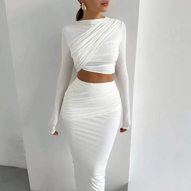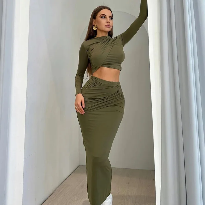 Sophisticated two-piece ensemble featuring a ruched long-sleeve crop top and high-waist bodycon skirt. Premium blended fabric creates a streamlined silhouette perfect for spring and summer occasions. Available in classic black, army green, and creamy-white. Versatile streetwear design transitions effortlessly from day to evening wear.