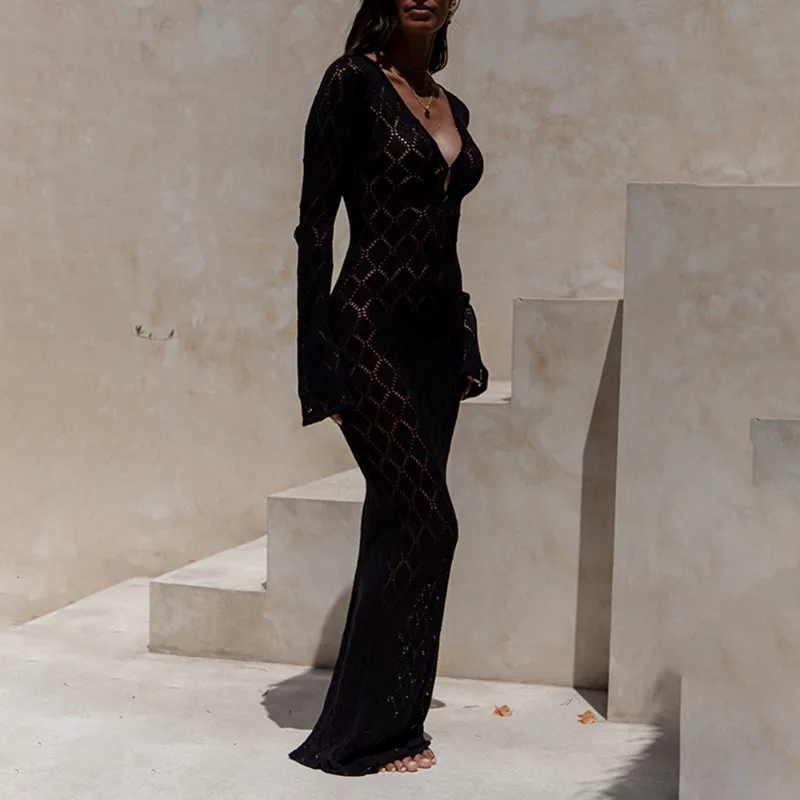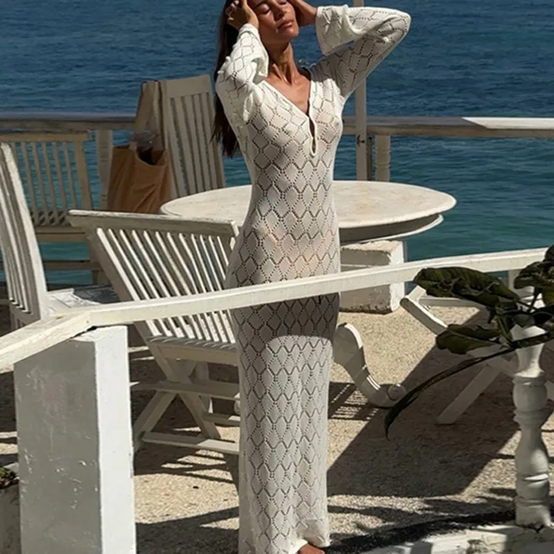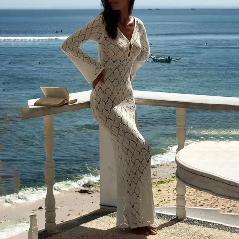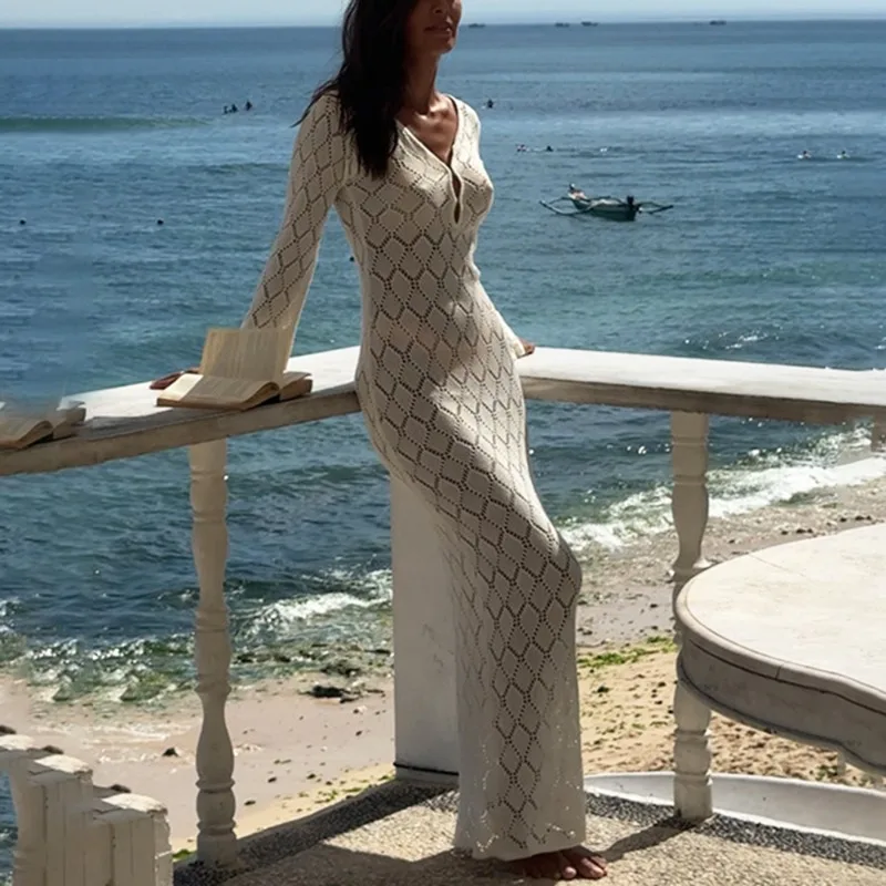 V-Neck Hollow Out Knitted Beach Cover-Up Dress – Ankle Length