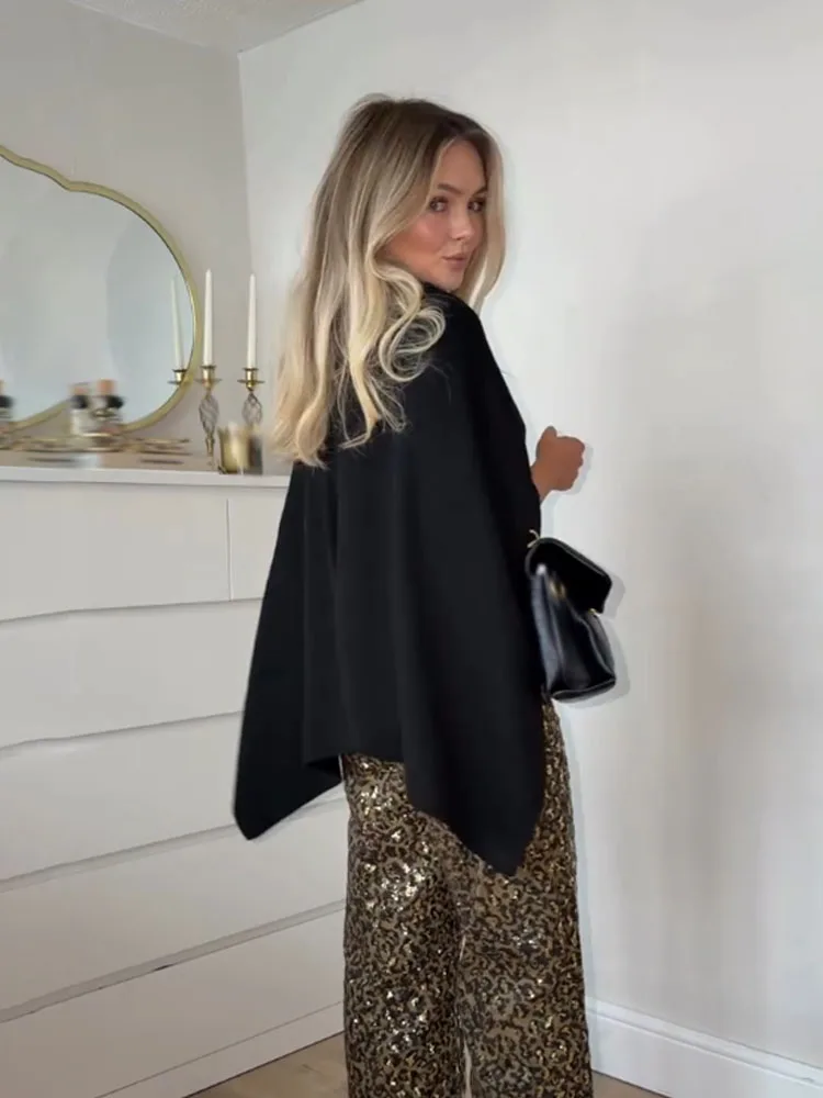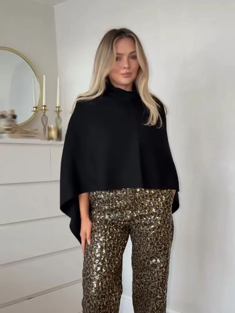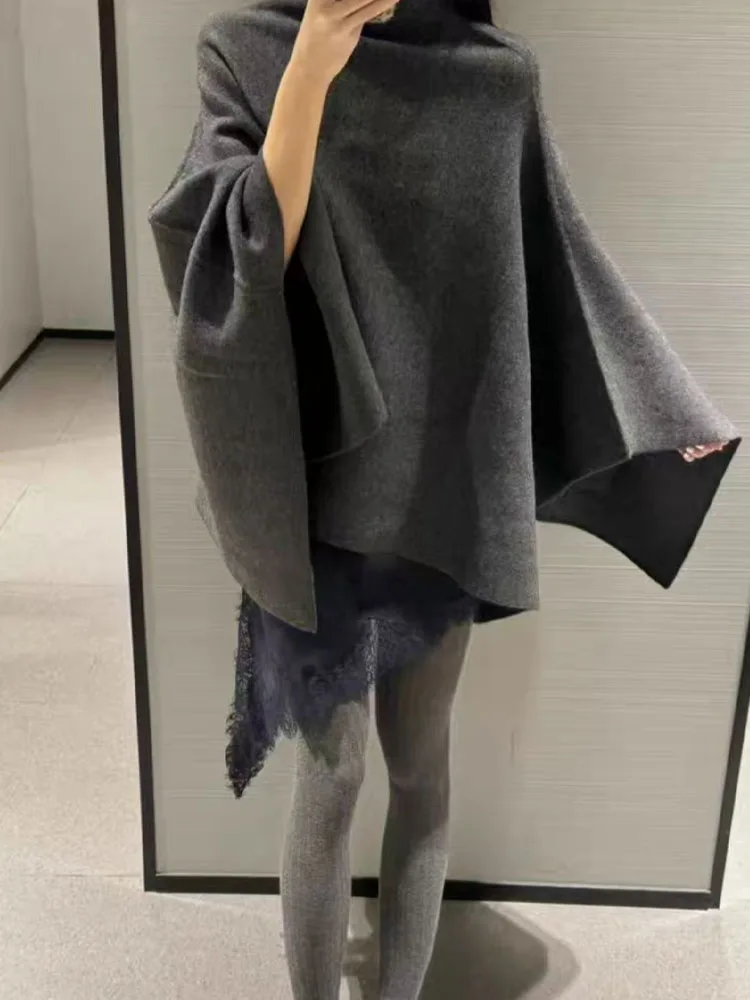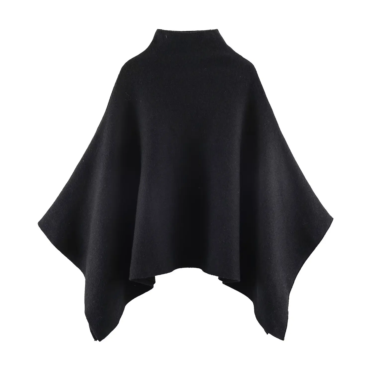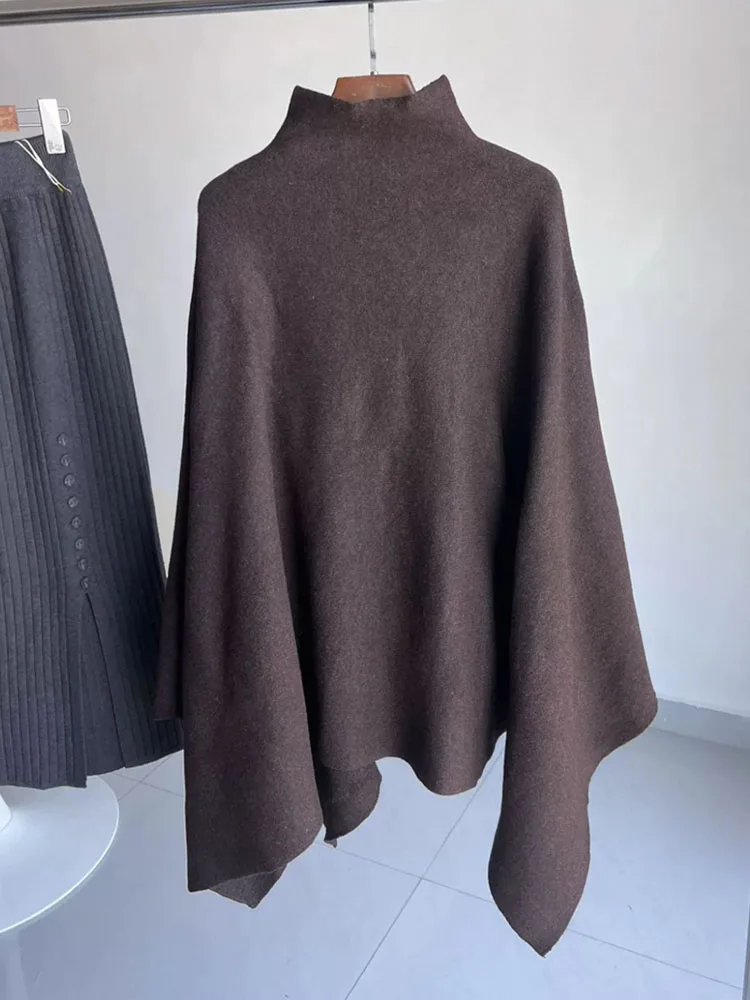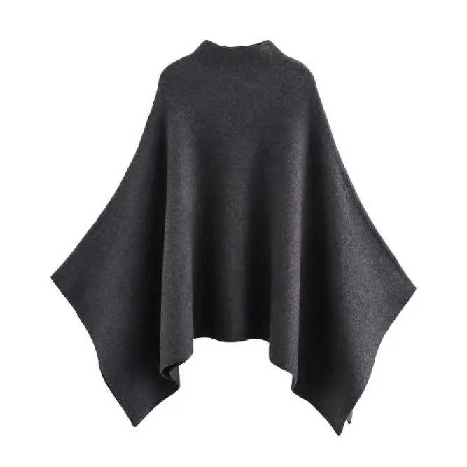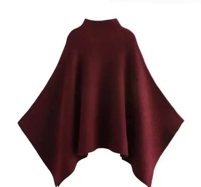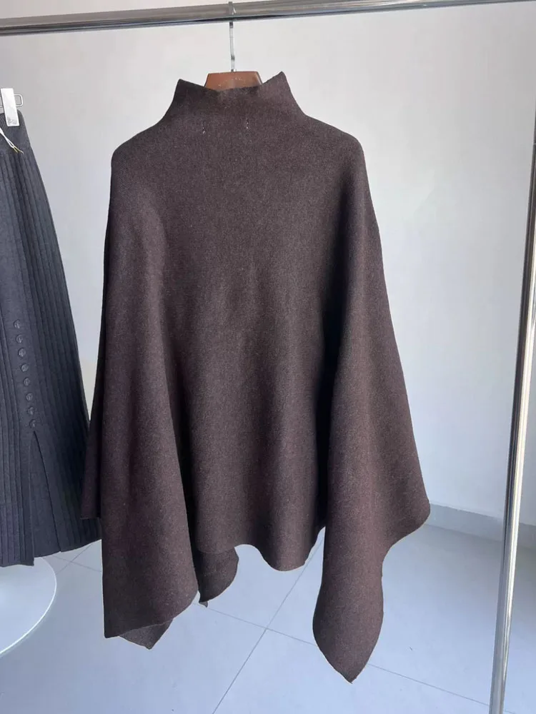 This knitted cape coat offers a considered layer in solid colours, designed for middle-aged women who appreciate versatile, modern outerwear. Featuring a loose fit and a turtleneck collar, it provides comfortable coverage and effortless style for all seasons.