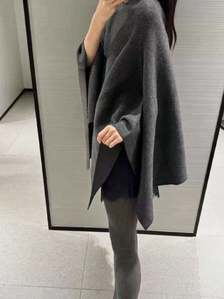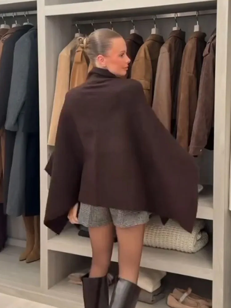 Styling suggestions include pairing this cape coat with tailored trousers and loafers for a polished daytime look, or slim jeans and ankle boots for casual outings. It also complements midi skirts and simple knitwear for relaxed weekends. Its understated design fits well in both professional and social settings.