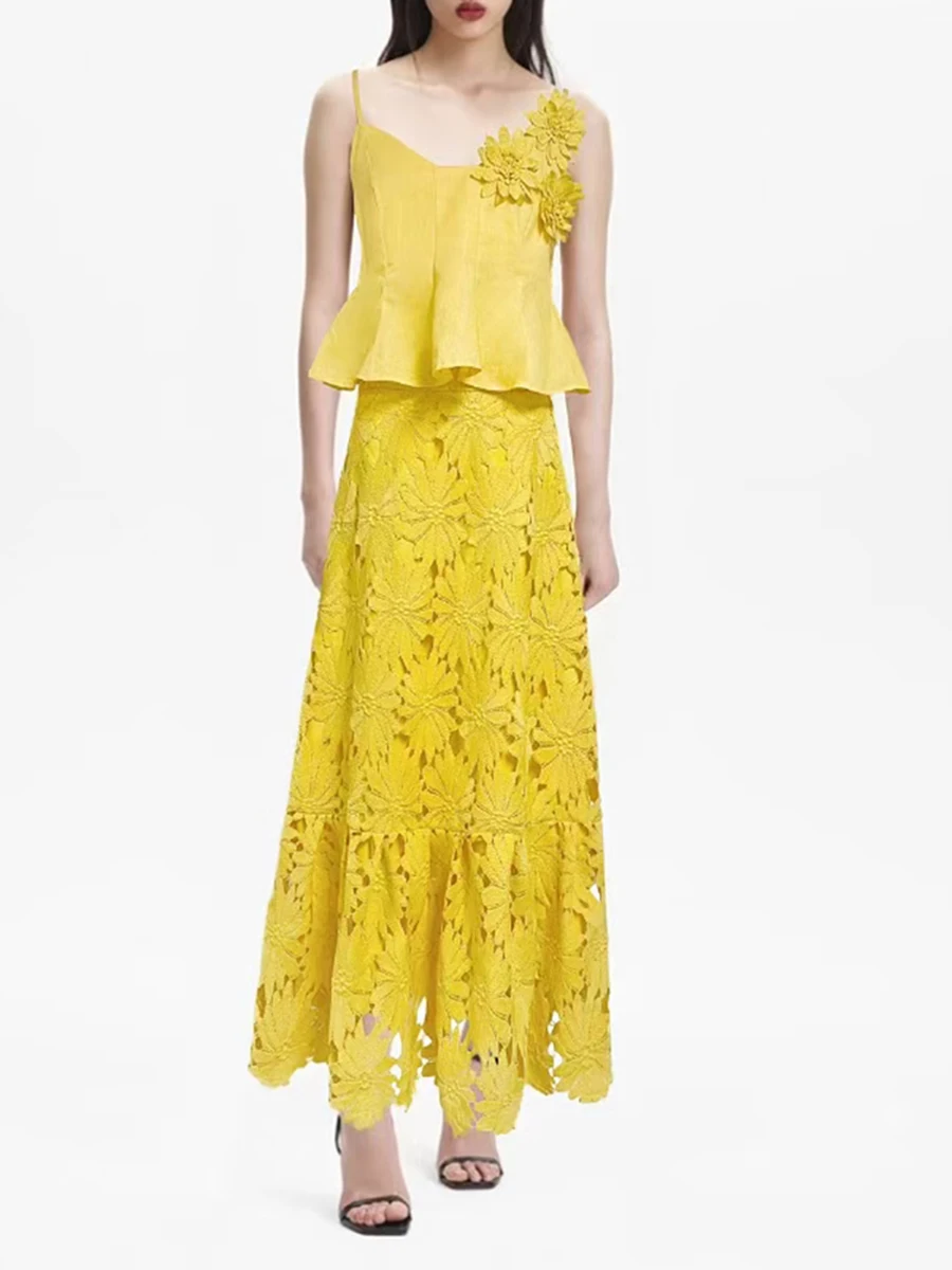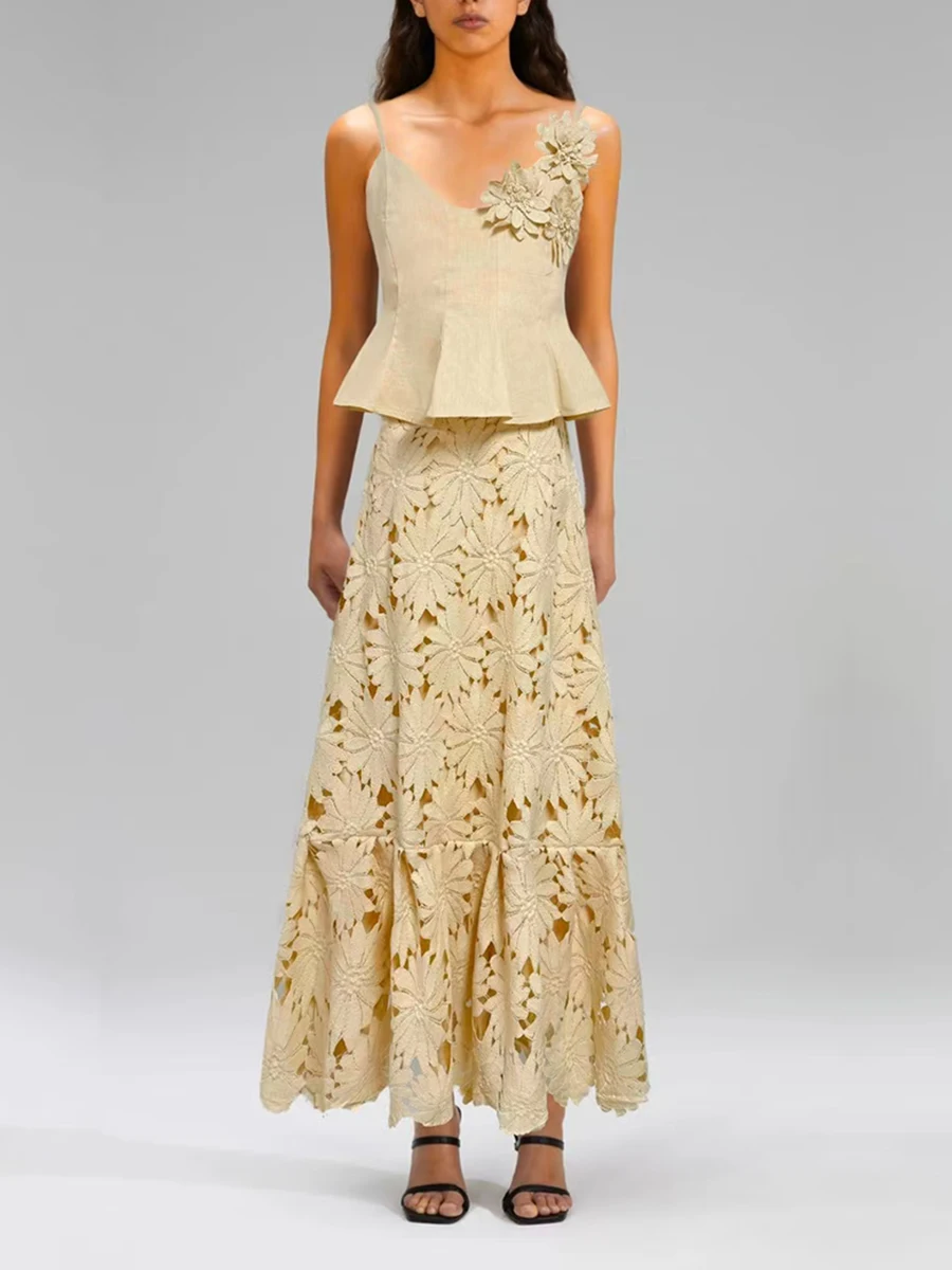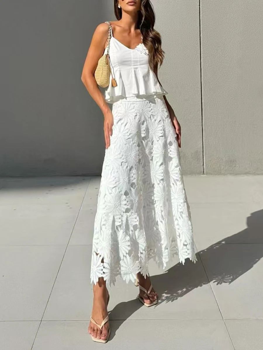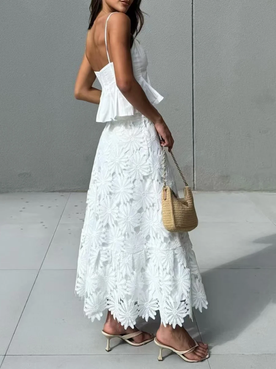 Sophisticated two-piece set featuring a sleeveless floral tank with square neckline paired with a flowing A-line ankle-length skirt. Crafted from premium cotton-polyester blend with elegant applique details. High-waist design creates a flattering silhouette perfect for resort getaways or summer occasions. Available in versatile black, white, yellow, and khaki. Comfortable elastic waist ensures all-day comfort while maintaining refined style.