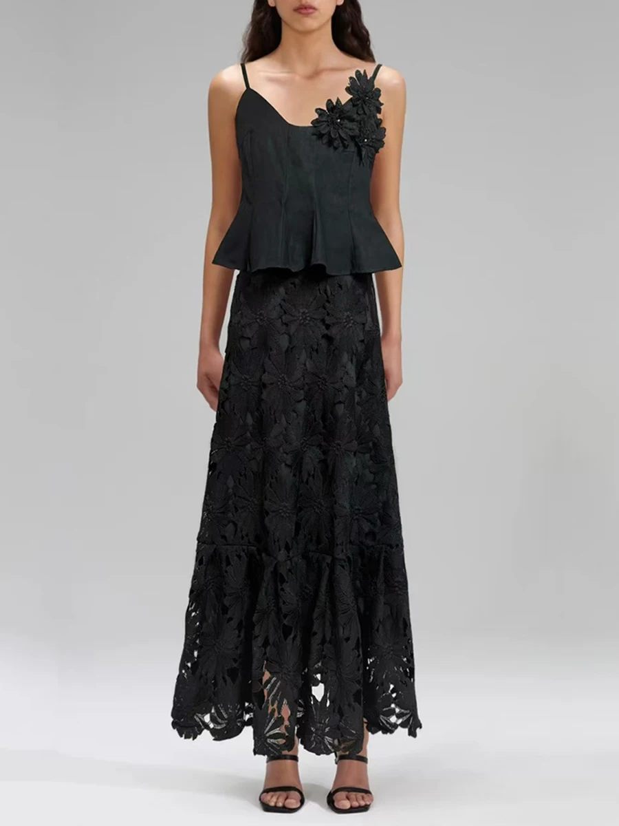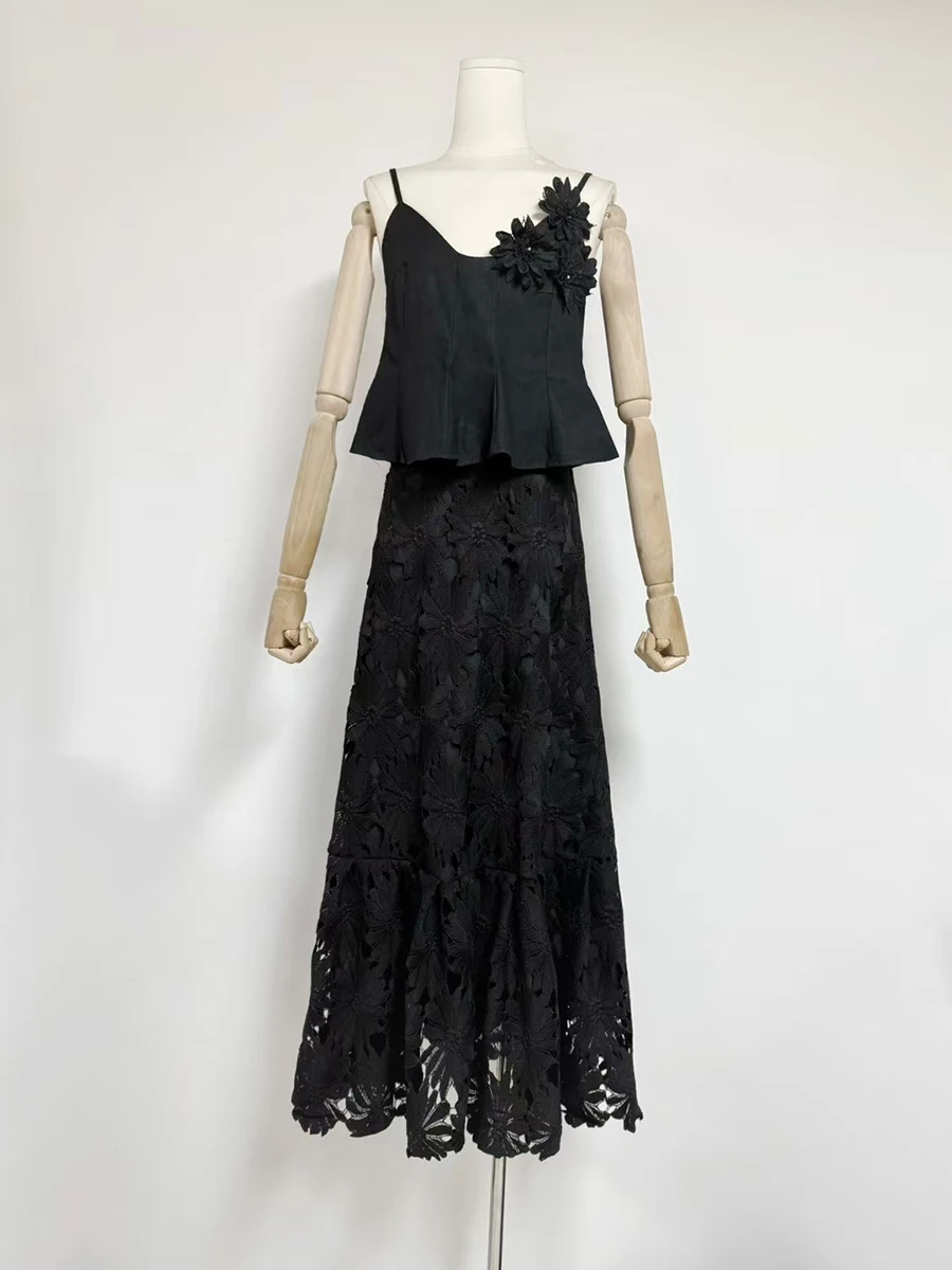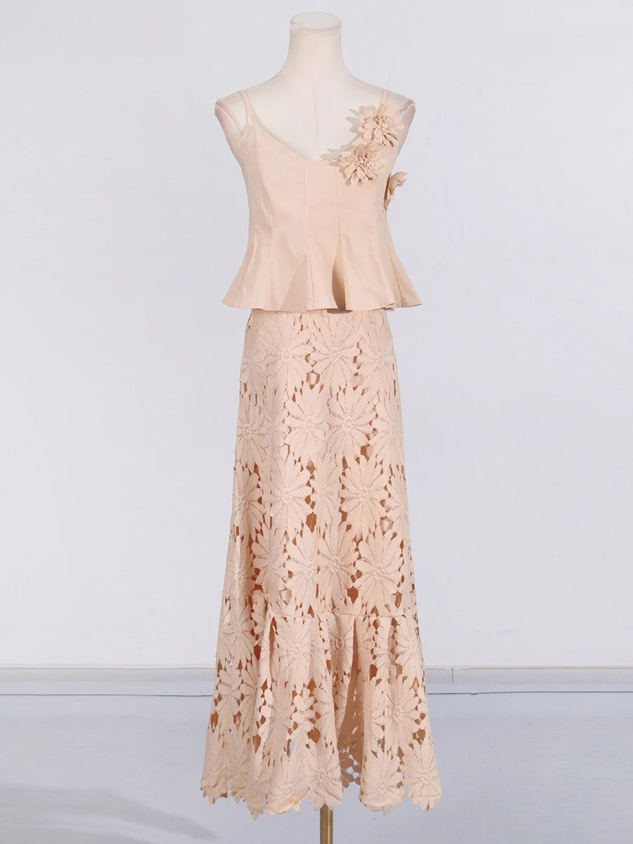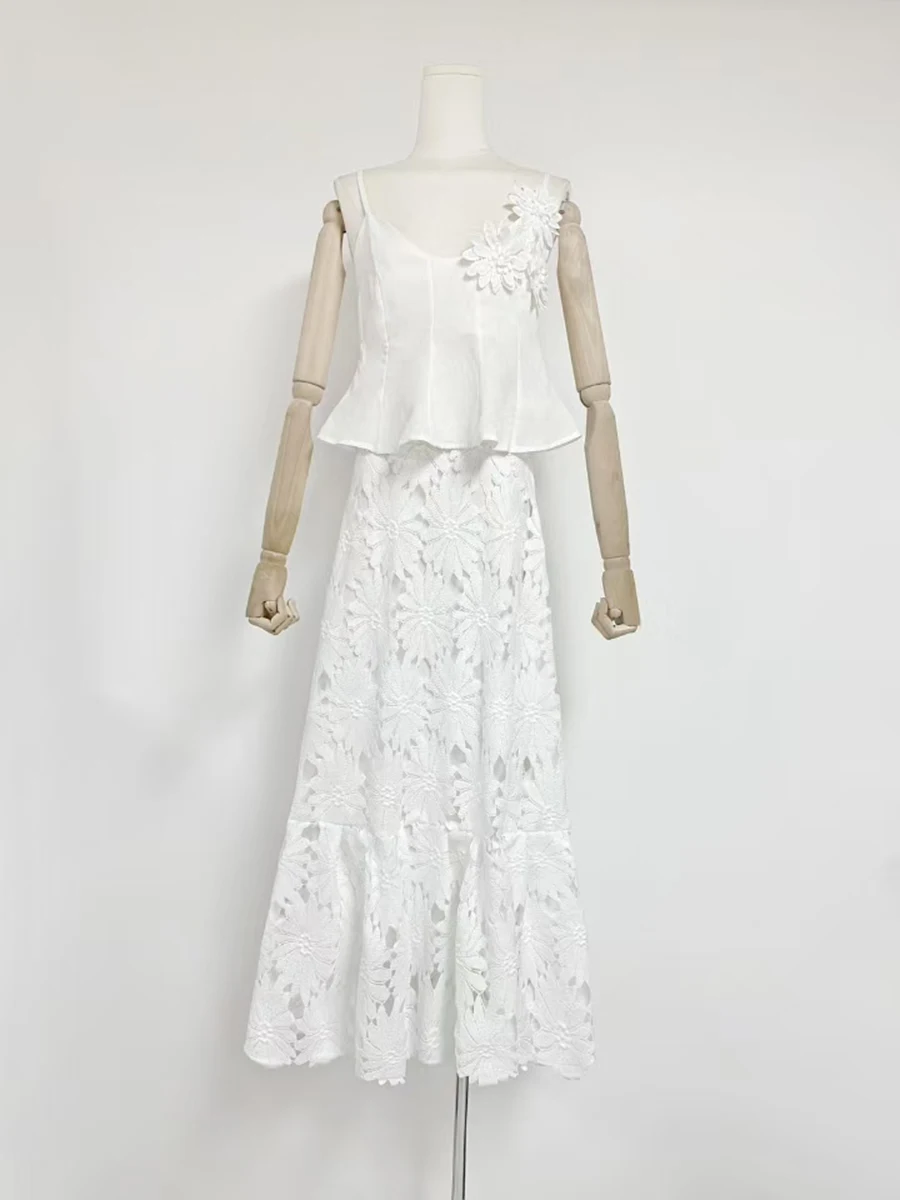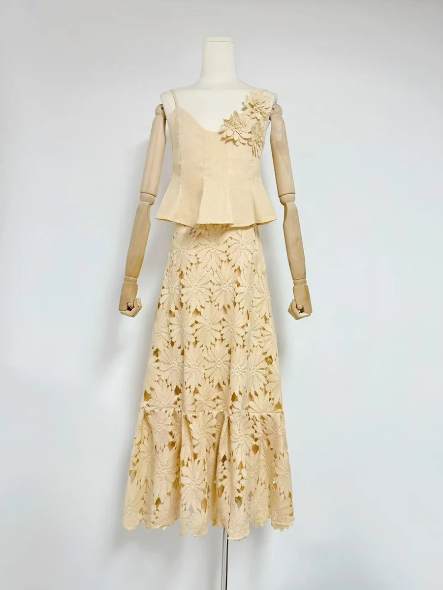 Sophisticated two-piece set featuring a sleeveless floral tank with square neckline paired with a flowing A-line ankle-length skirt. Crafted from premium cotton-polyester blend with elegant applique details. High-waist design creates a flattering silhouette perfect for resort getaways or summer occasions. Available in versatile black, white, yellow, and khaki. Comfortable elastic waist ensures all-day comfort while maintaining refined style.