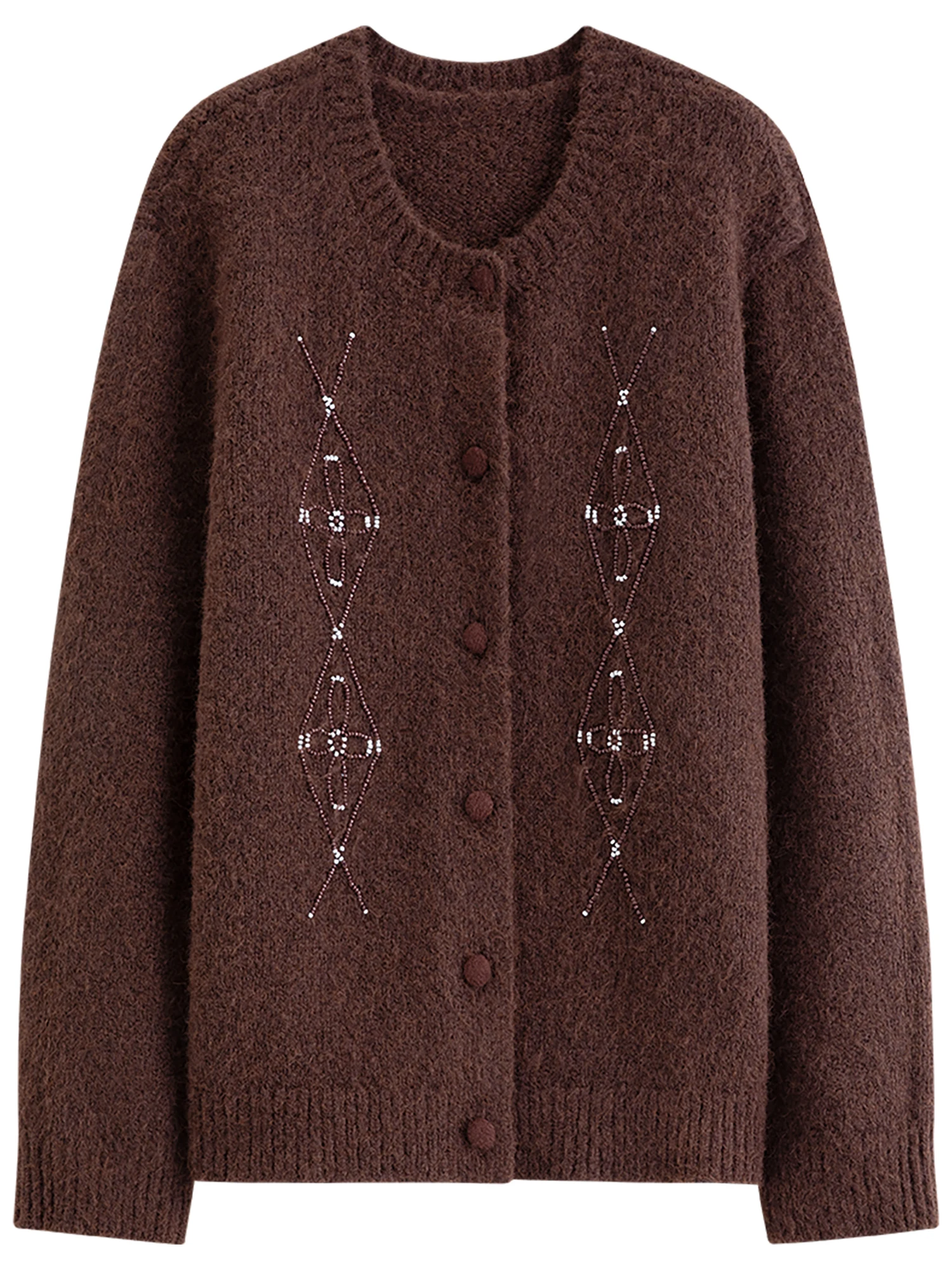 Designed for the discerning woman seeking refined casual wear, this Vintage Beaded Round Neck Knit Cardigan elegantly combines comfort with subtle ornamentation. Its loose fit and medium-weight knit provide gentle warmth through autumn and winter, while the rhinestone details add a delicate touch of sophistication.