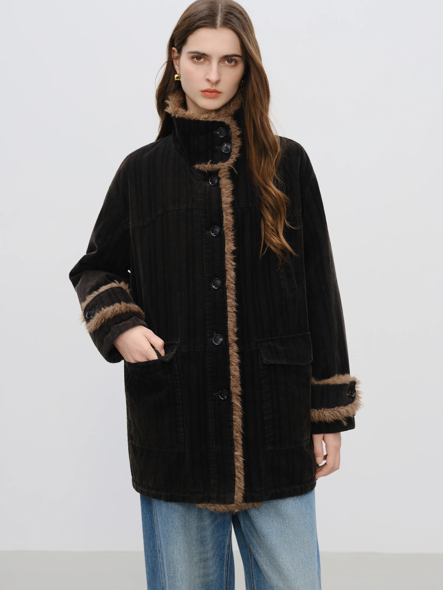 A: The jacket features a loose fit designed to allow comfortable layering. It is recommended to choose your usual size for a relaxed silhouette.